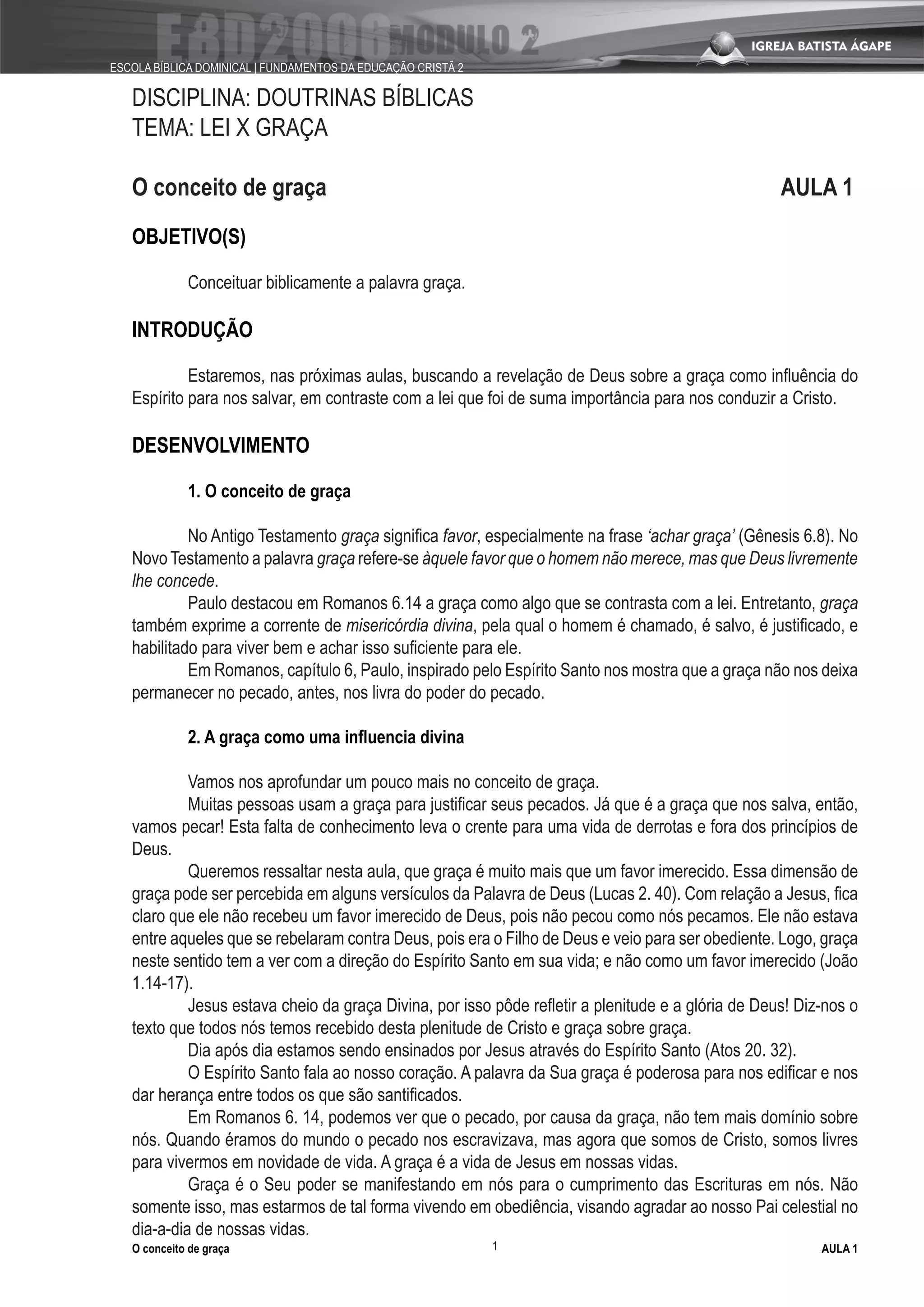 O documento discute o conceito de graça e lei na Bíblia. A graça é definida como o favor divino que salva o homem, em contraste com a lei que revela o pecado. A lei conduz o homem a Cristo, único meio de salvação. Cristo libertou os crentes da maldição da lei por meio de Sua graça.