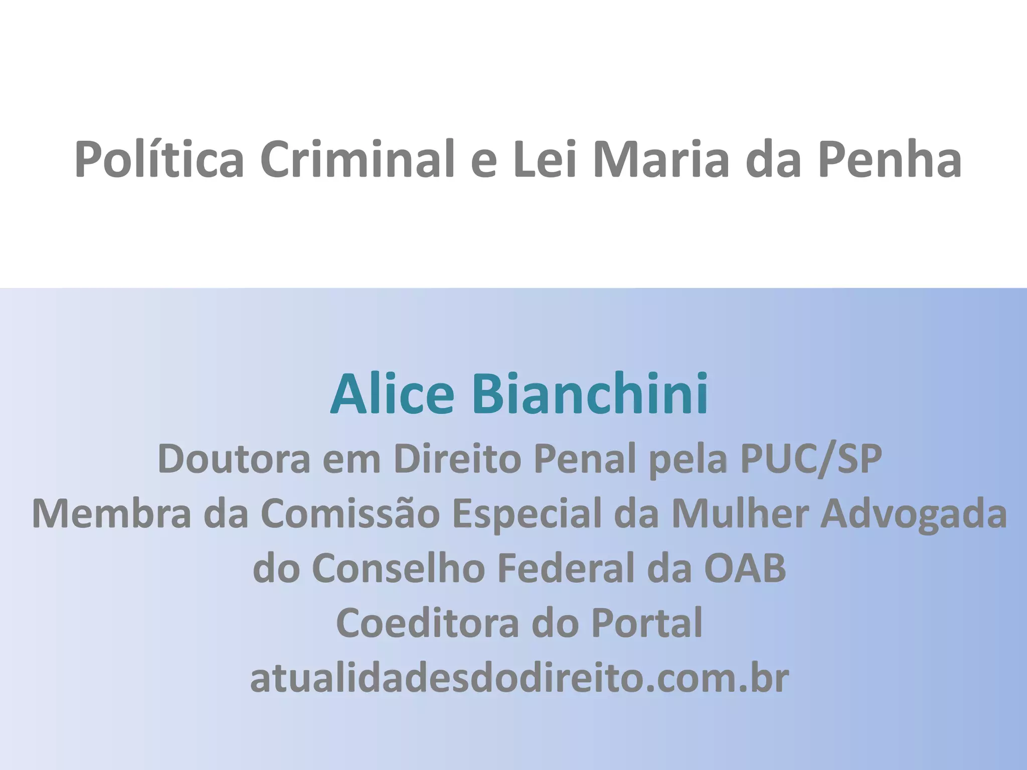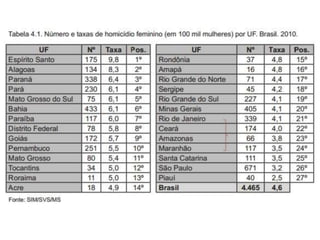 Este documento discute a violência contra as mulheres no Brasil e a Lei Maria da Penha. Apresenta estatísticas alarmantes sobre a violência de gênero no país e perceções da sociedade sobre o assunto. Também descreve os objetivos e mecanismos da Lei Maria da Penha para coibir e prevenir a violência doméstica e familiar contra a mulher.
