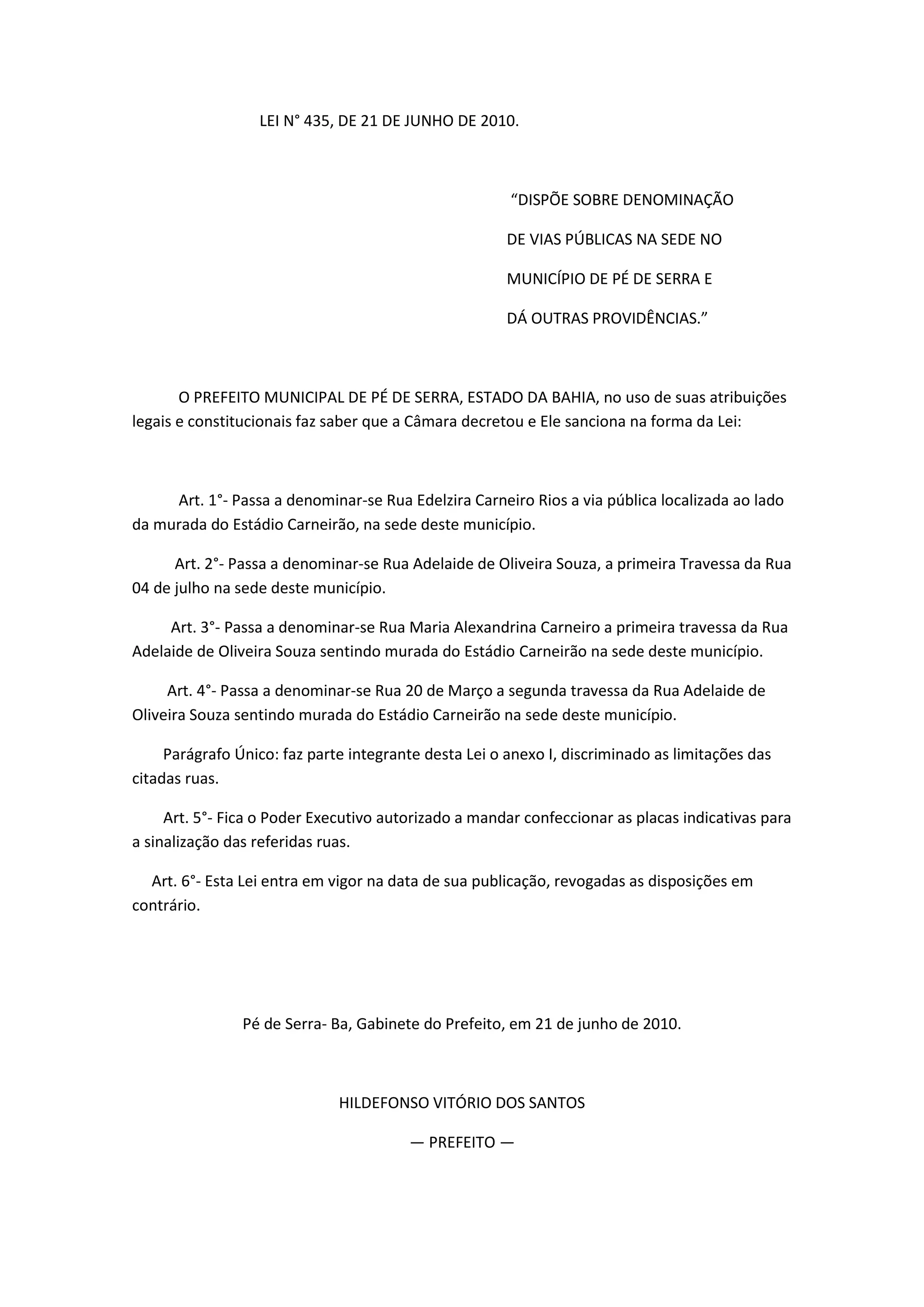 A lei renomeia várias ruas na cidade de Pé de Serra, Bahia, incluindo a Rua Edelzira Carneiro Rios, a Rua Adelaide de Oliveira Souza e a Rua Maria Alexandrina Carneiro. A lei também autoriza o poder executivo a criar placas para sinalizar as novas denominações das ruas.