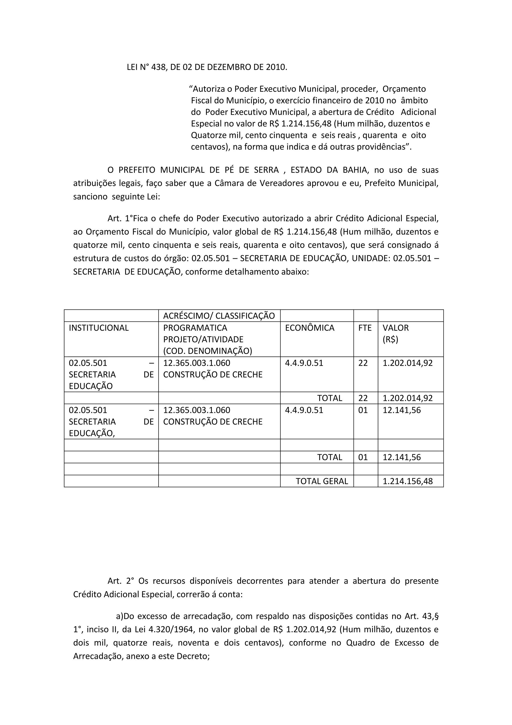 A lei autoriza o Poder Executivo Municipal a abrir um crédito adicional especial de R$ 1.214.156,48 para a Secretaria de Educação. Os recursos virão de excesso de arrecadação e da anulação parcial de dotações orçamentárias e serão usados para a construção de creches. A lei entra em vigor na data de sua publicação.