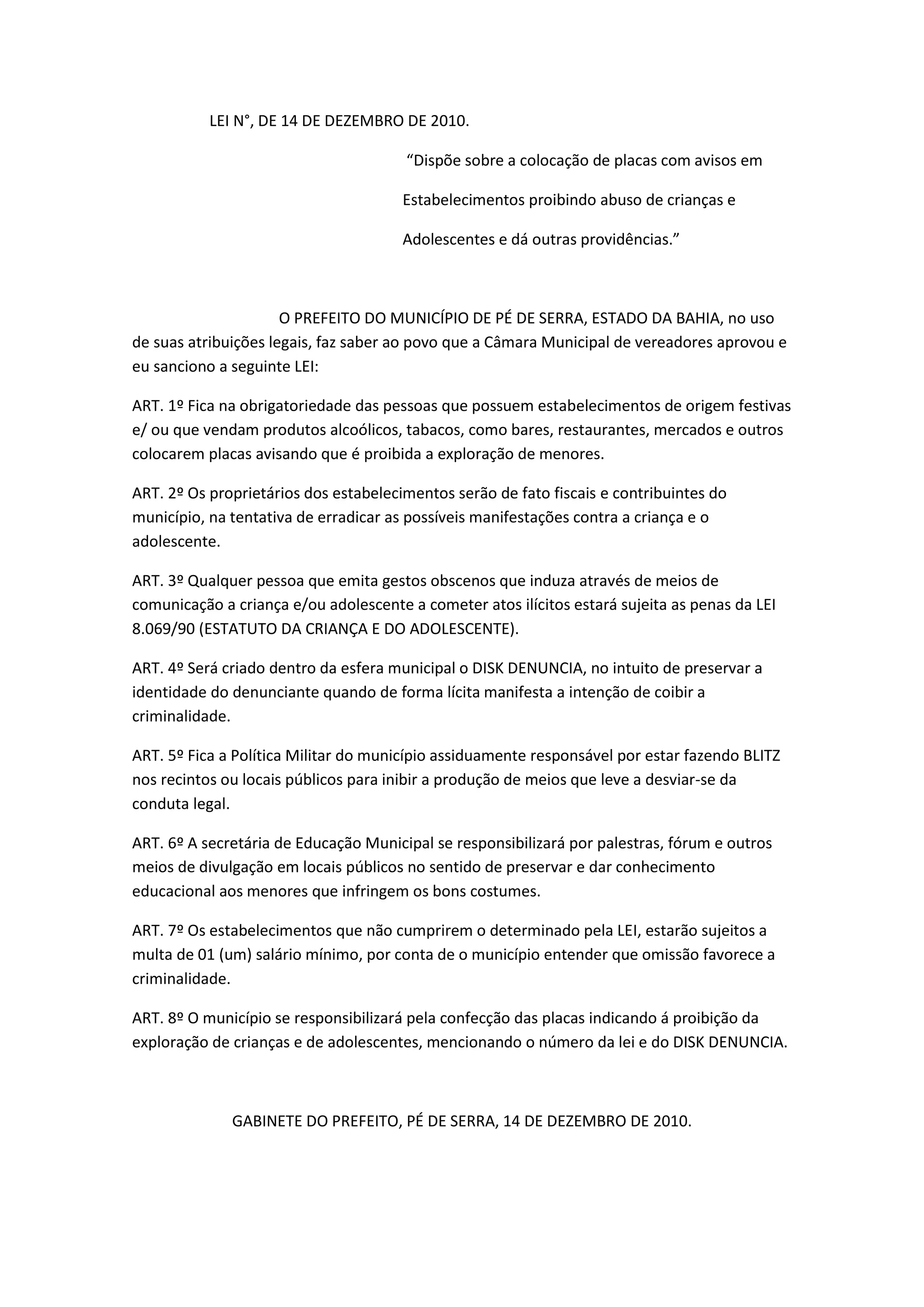 A lei obriga estabelecimentos como bares e mercados a colocarem placas proibindo a exploração de crianças e adolescentes. Os proprietários devem fiscalizar a proibição e denúncias podem ser feitas de forma anônima. Estabelecimentos que não cumprirem a lei serão multados.
