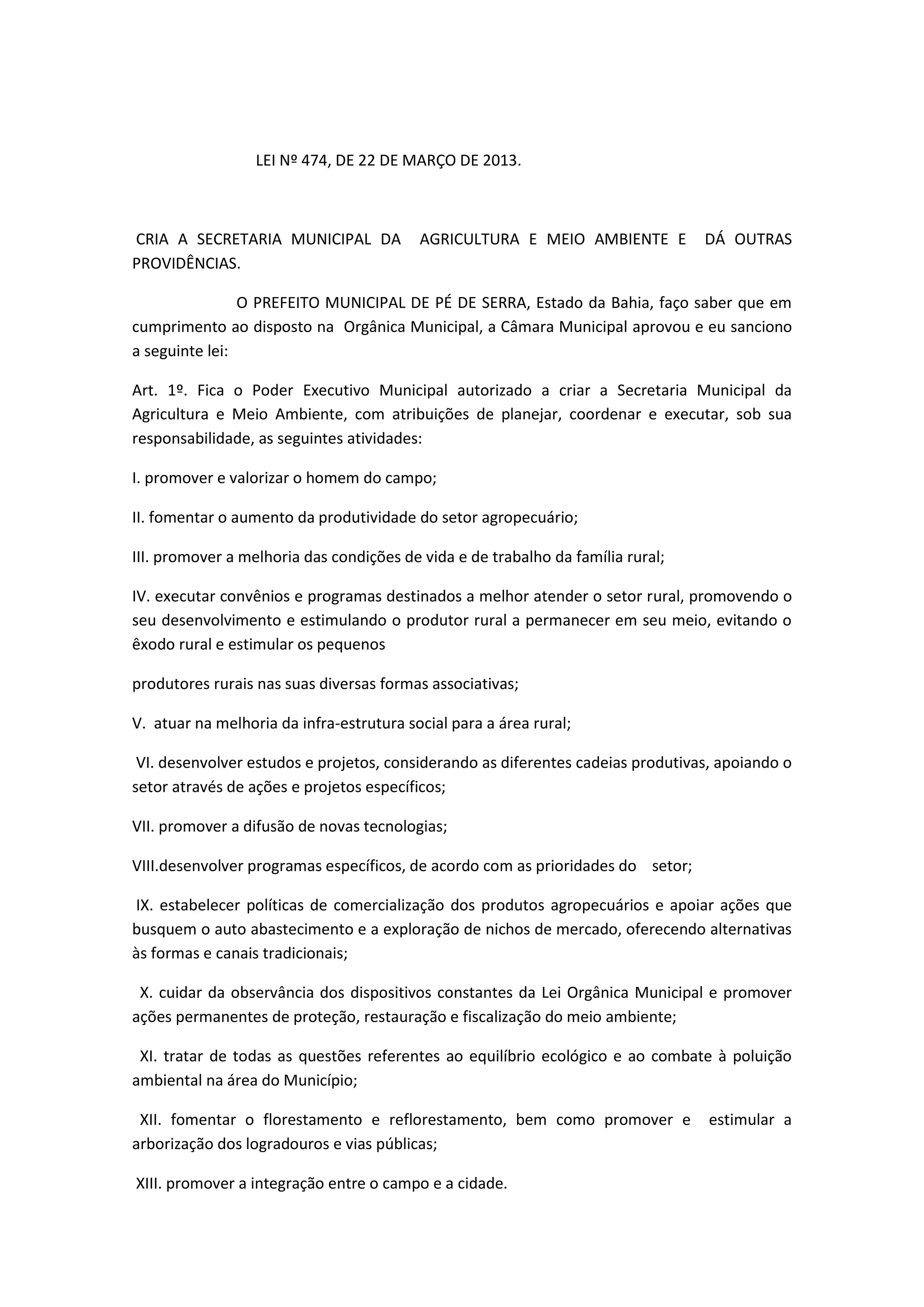 A lei cria a Secretaria Municipal da Agricultura e Meio Ambiente no município de Pé de Serra, na Bahia. A secretaria terá responsabilidades como promover o desenvolvimento do setor agropecuário, proteger o meio ambiente e integrar o campo e a cidade. A lei também define a estrutura organizacional da nova secretaria e os cargos que a comporão.