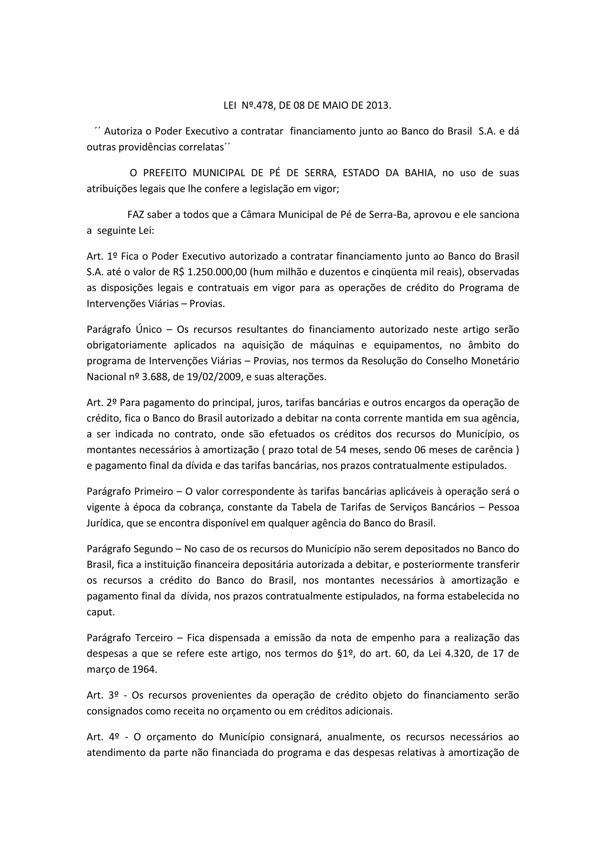 Esta lei autoriza o Poder Executivo de Pé de Serra, Bahia, a contratar um financiamento de até R$1,25 milhão junto ao Banco do Brasil para aquisição de máquinas e equipamentos para o programa de intervenções viárias, com pagamento em 54 meses incluindo 6 meses de carência. Os recursos do financiamento serão usados conforme a Resolução do Conselho Monetário Nacional no 3.688/2009 e incluídos no orçamento municipal.