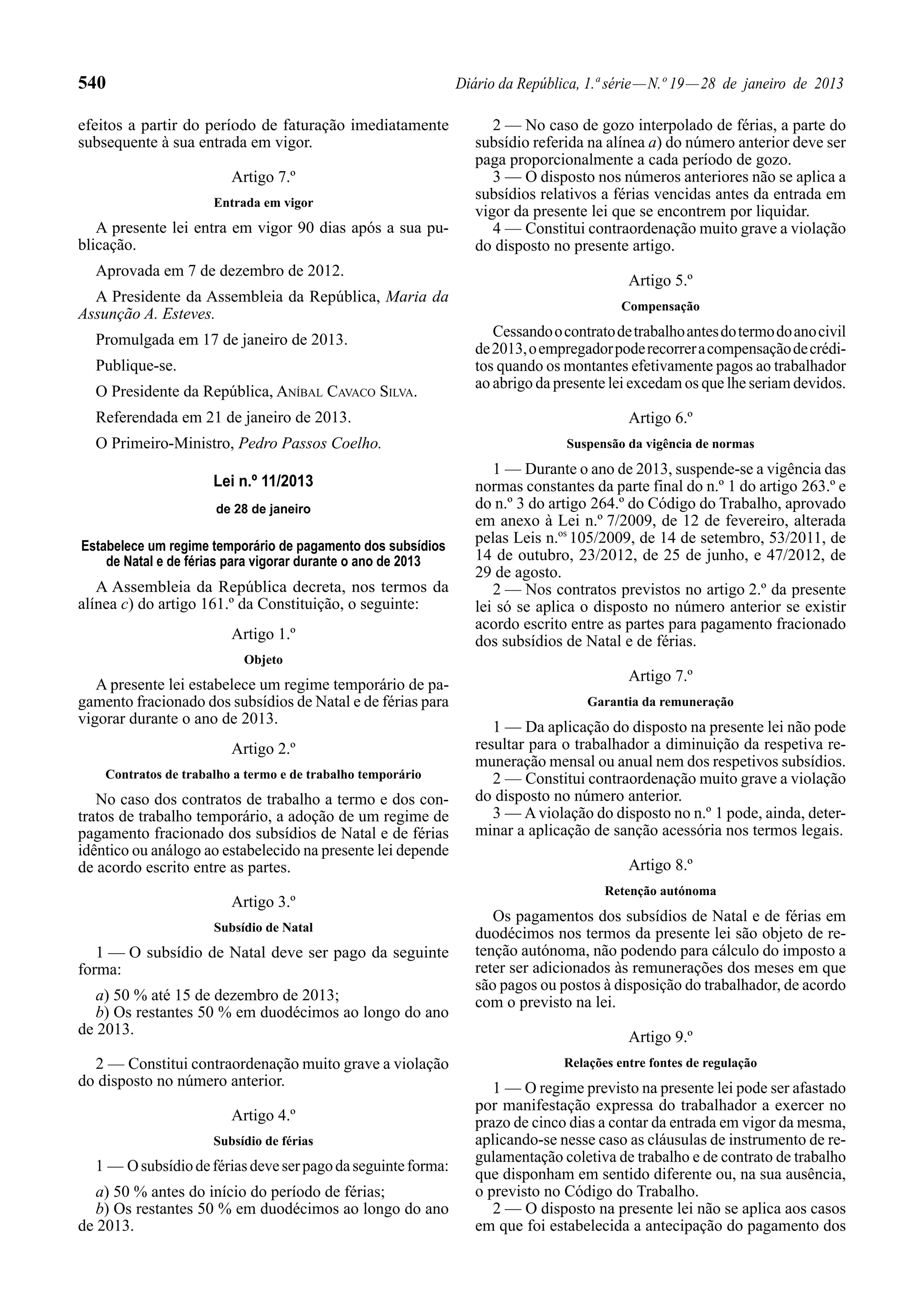 Este documento estabelece um regime temporário de pagamento fracionado dos subsídios de Natal e férias durante o ano de 2013, definindo que metade do subsídio de Natal deve ser pago até 15 de dezembro e a outra metade em duodécimos ao longo do ano, e que metade do subsídio de férias deve ser pago antes das férias e a outra metade em duodécimos. Além disso, recomenda ao Governo medidas para combater novas drogas, incluindo a criação de um procedimento para suspender substâncias pot