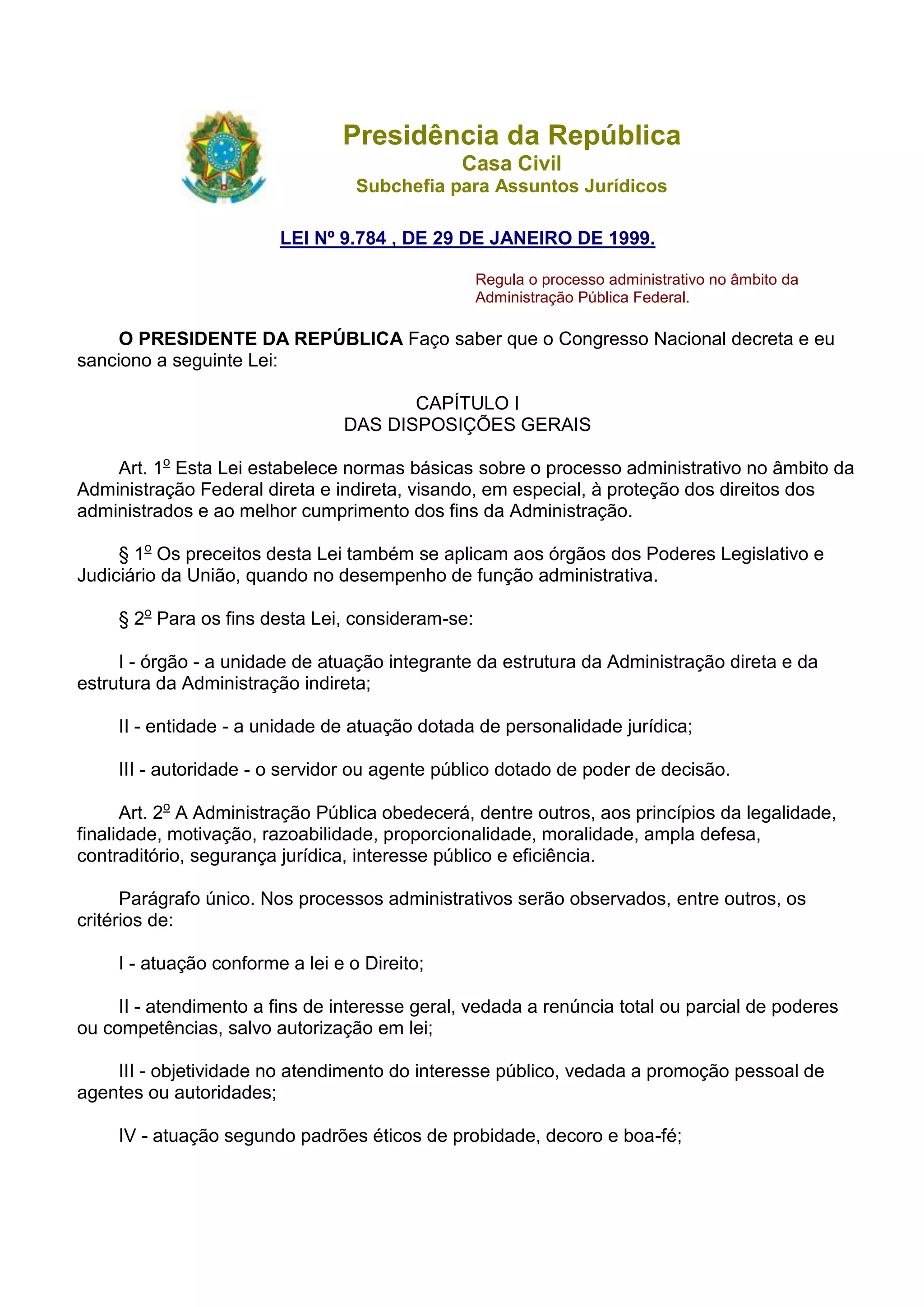 Este documento estabelece normas sobre o processo administrativo na administração pública federal, garantindo os direitos dos administrados e a eficiência da administração. Cobre tópicos como competência, direitos e deveres dos envolvidos, início, instrução e comunicação de atos do processo.