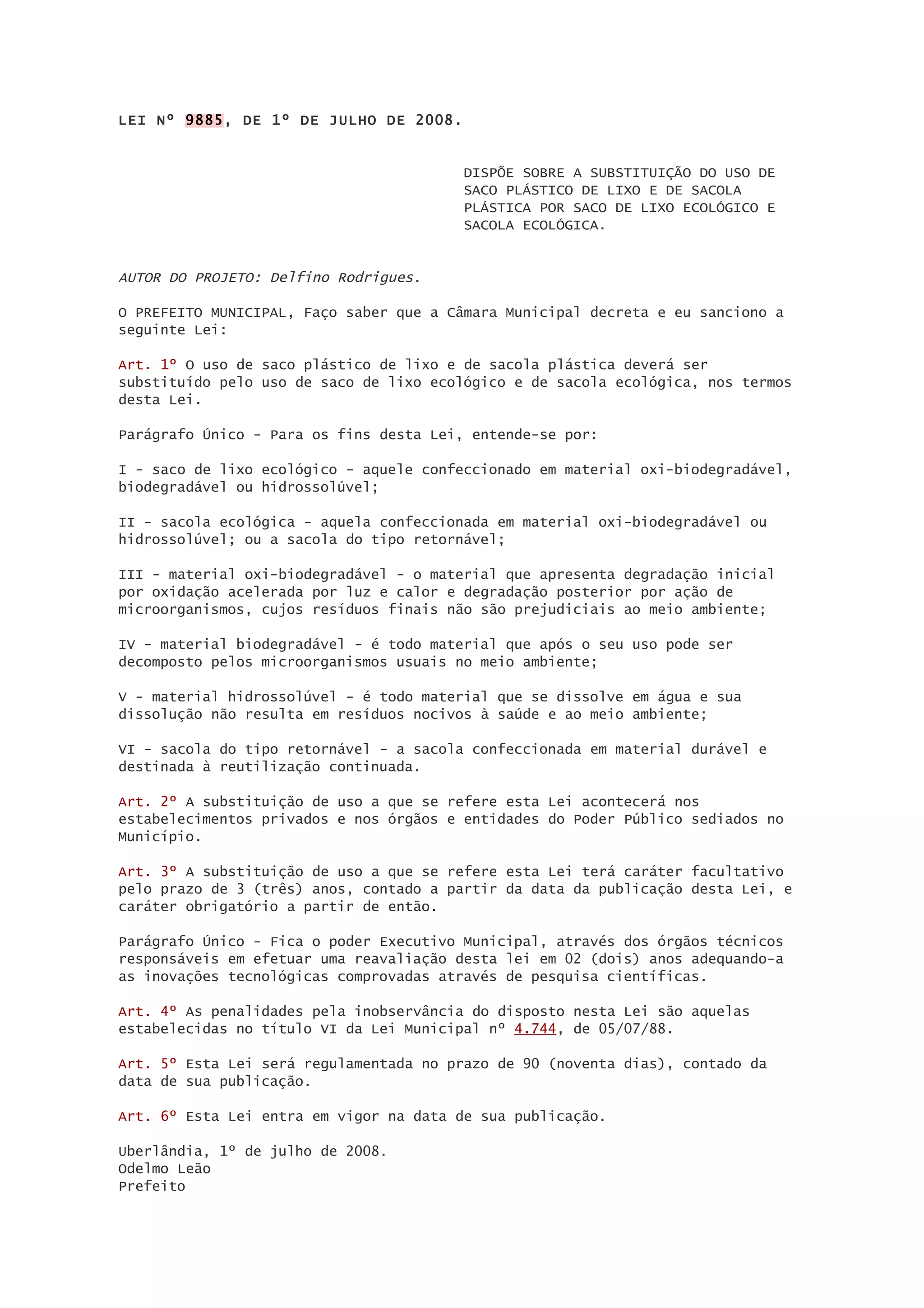 A lei substitui o uso de sacolas e sacos plásticos por alternativas ecológicas nos estabelecimentos públicos e privados do município. Durante 3 anos, a substituição é facultativa, tornando-se obrigatória após. A lei define sacos ecológicos e sacolas como aqueles feitos de materiais biodegradáveis, hidrossolúveis ou reutilizáveis.