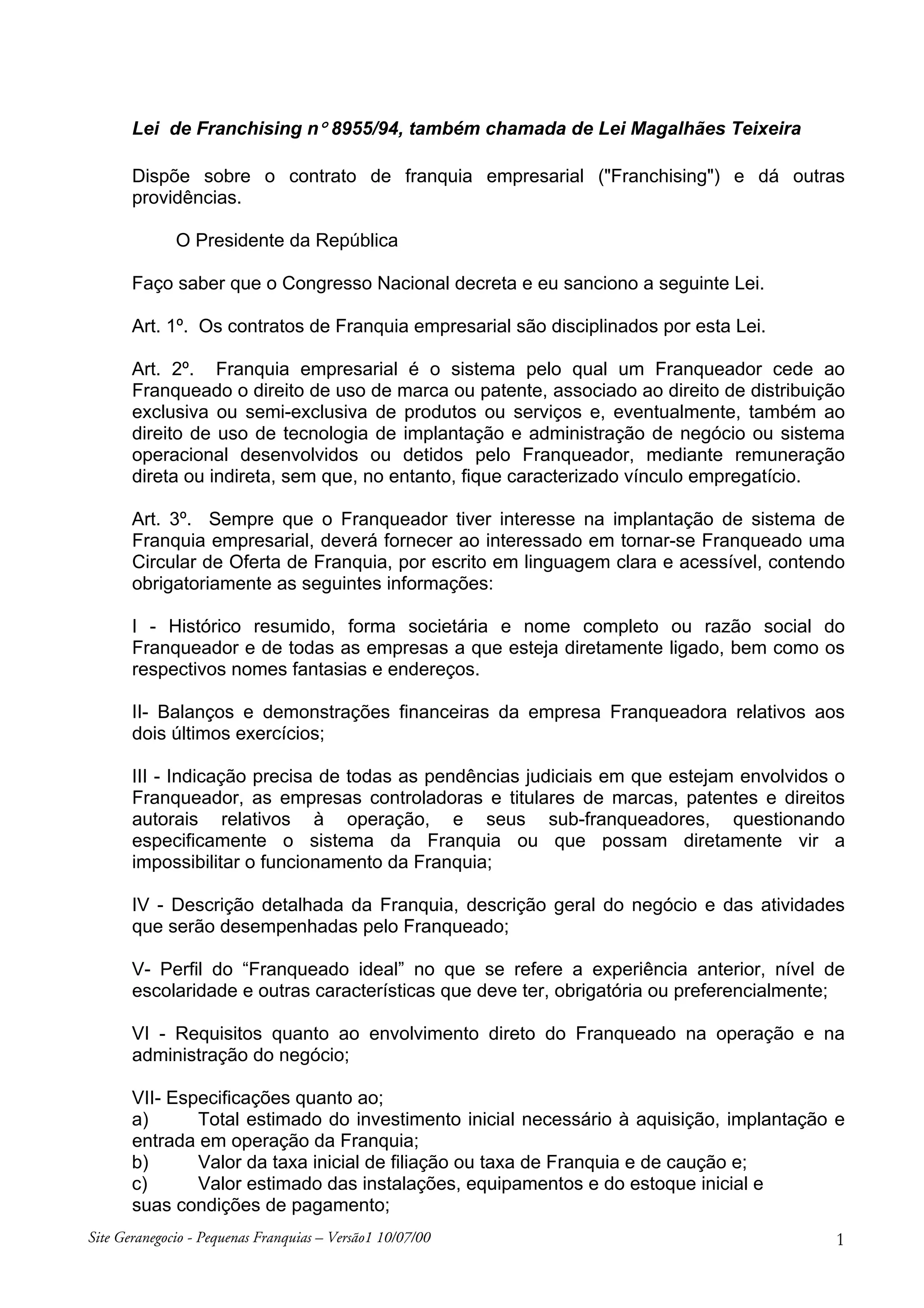 A Lei de Franchising n° 8955/94 estabelece as regras para contratos de franquia no Brasil, exigindo que franqueadores forneçam informações completas sobre o negócio em uma Circular de Oferta de Franquia e definindo direitos e obrigações de franqueadores e franqueados.