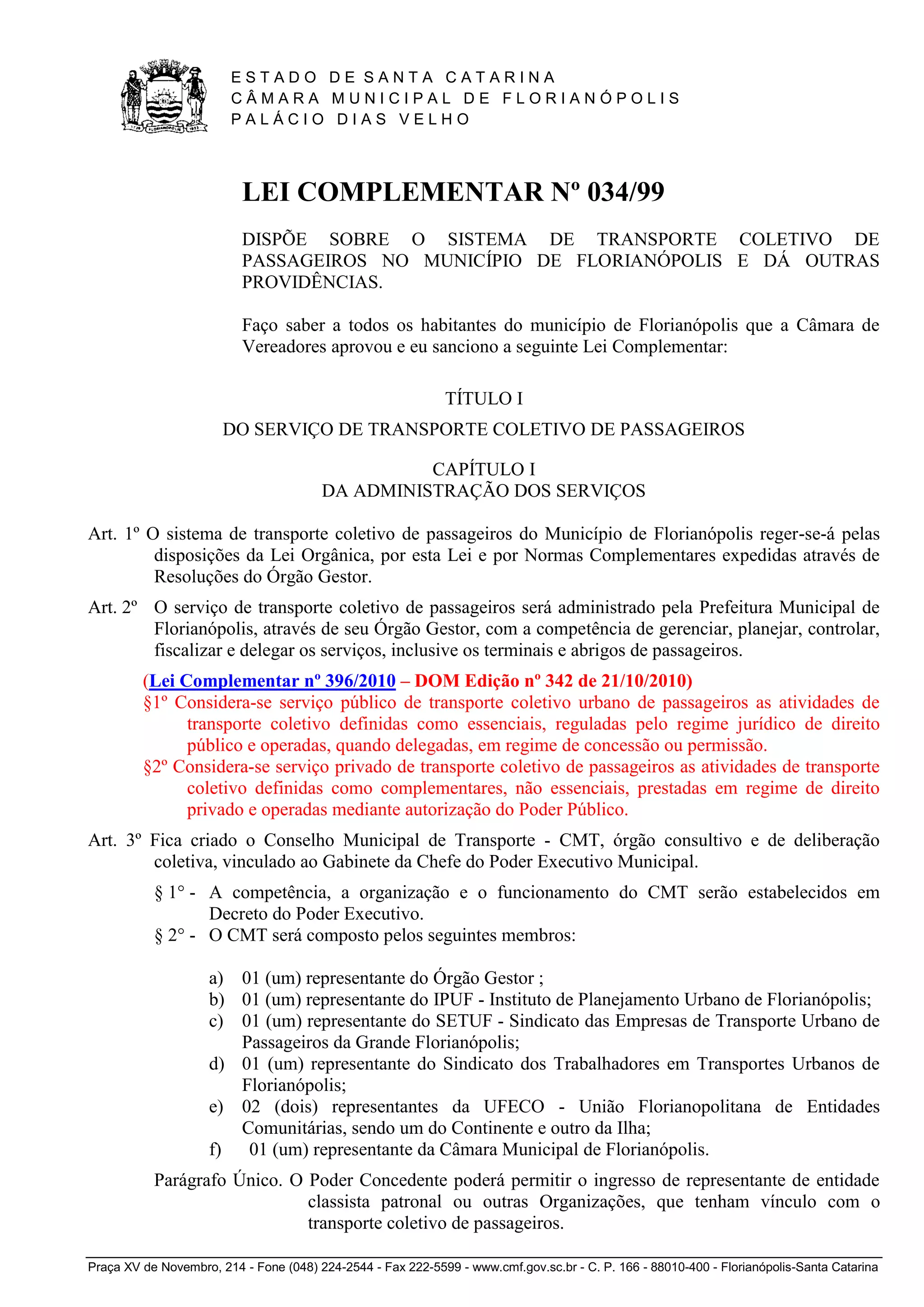 Este documento estabelece as diretrizes para o sistema de transporte coletivo de passageiros no município de Florianópolis. Ele define que o serviço será administrado pela prefeitura municipal através de um órgão gestor e cria o Conselho Municipal de Transporte para assessorá-lo. Também classifica os diferentes tipos de serviços de transporte e estabelece suas características.