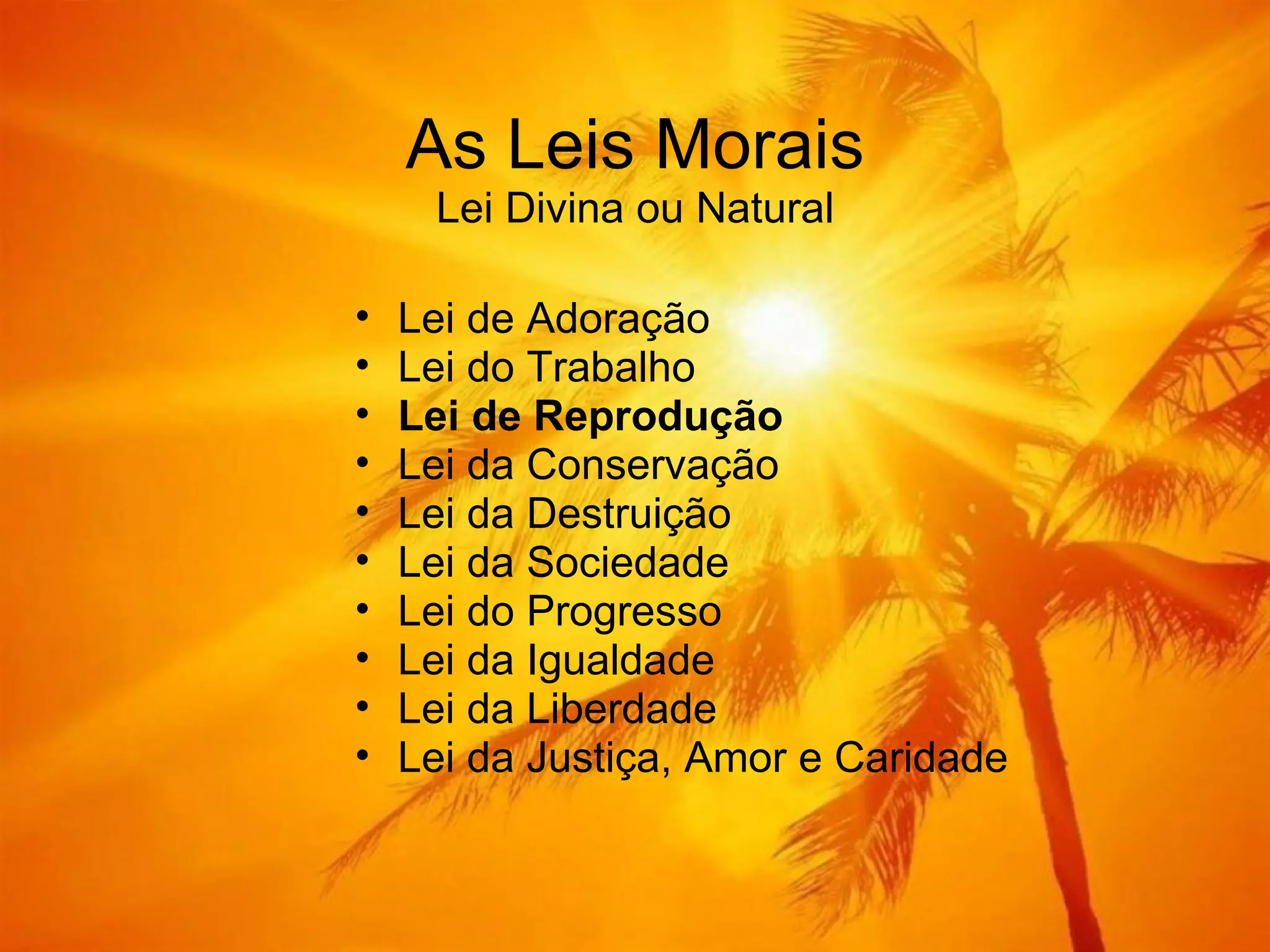 1) O documento discute vários aspectos relacionados às leis morais, leis naturais e leis humanas, incluindo a família, casamento, divórcio, sexo e evolução espiritual.