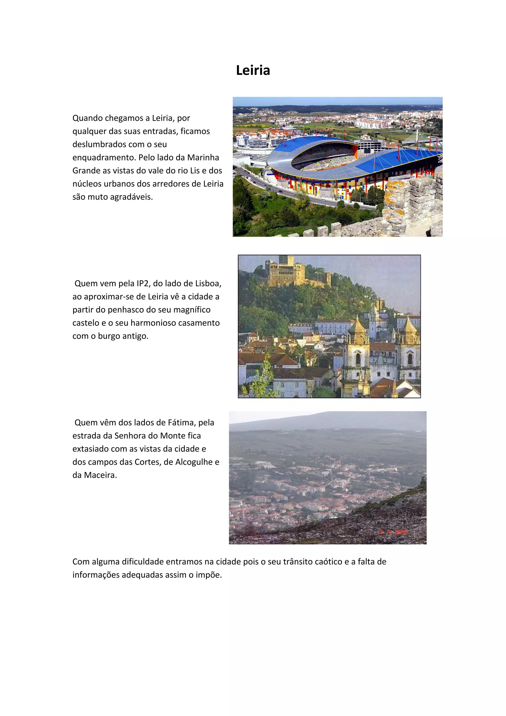 Este documento descreve as vistas deslumbrantes da cidade de Leiria e seu enquadramento histórico notável, mas também aponta problemas como trânsito caótico, falta de sinalização, casas degradadas, e esgotos que emitem cheiros na Praça Rodrigues Lobo.