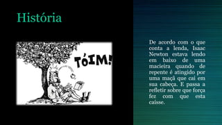 O documento descreve as três leis de Newton sobre movimento. A primeira lei fala sobre a inércia dos corpos e como Newton observou uma maçã caindo da árvore e isso o levou a refletir sobre forças. A segunda lei estabelece que a força sobre um corpo é diretamente proporcional à massa e aceleração. A terceira lei estabelece que para toda ação existe uma reação igual e oposta.