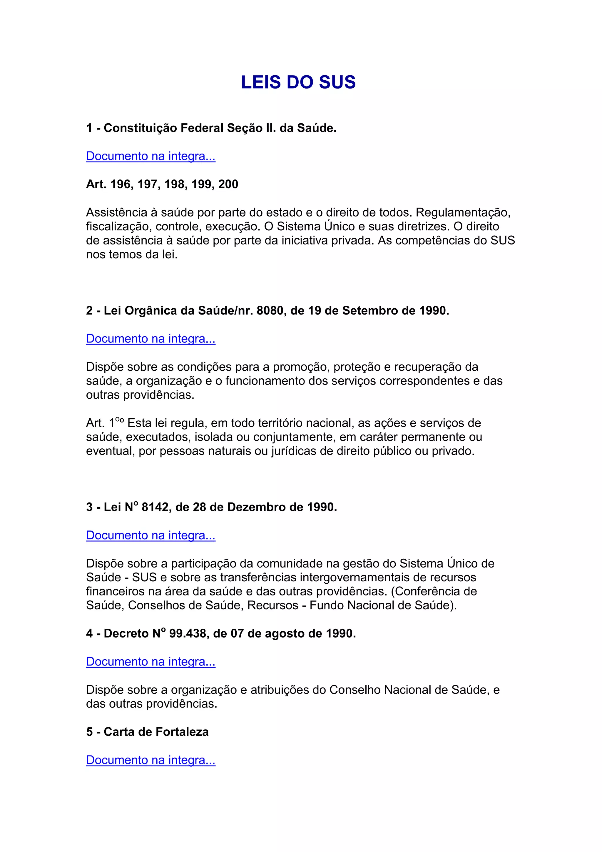 O documento descreve a legislação estruturante do Sistema Único de Saúde (SUS) no Brasil, incluindo a Constituição Federal de 1988, a Lei Orgânica da Saúde de 1990, a Lei que estabelece as diretrizes da participação da comunidade na gestão do SUS e a Carta de Fortaleza sobre as posições do setor da saúde no país.