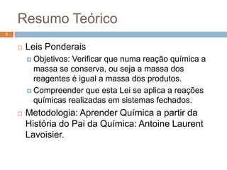 2) A lei estabelece que na reação química a massa total dos reagentes é igual à massa total dos produtos.