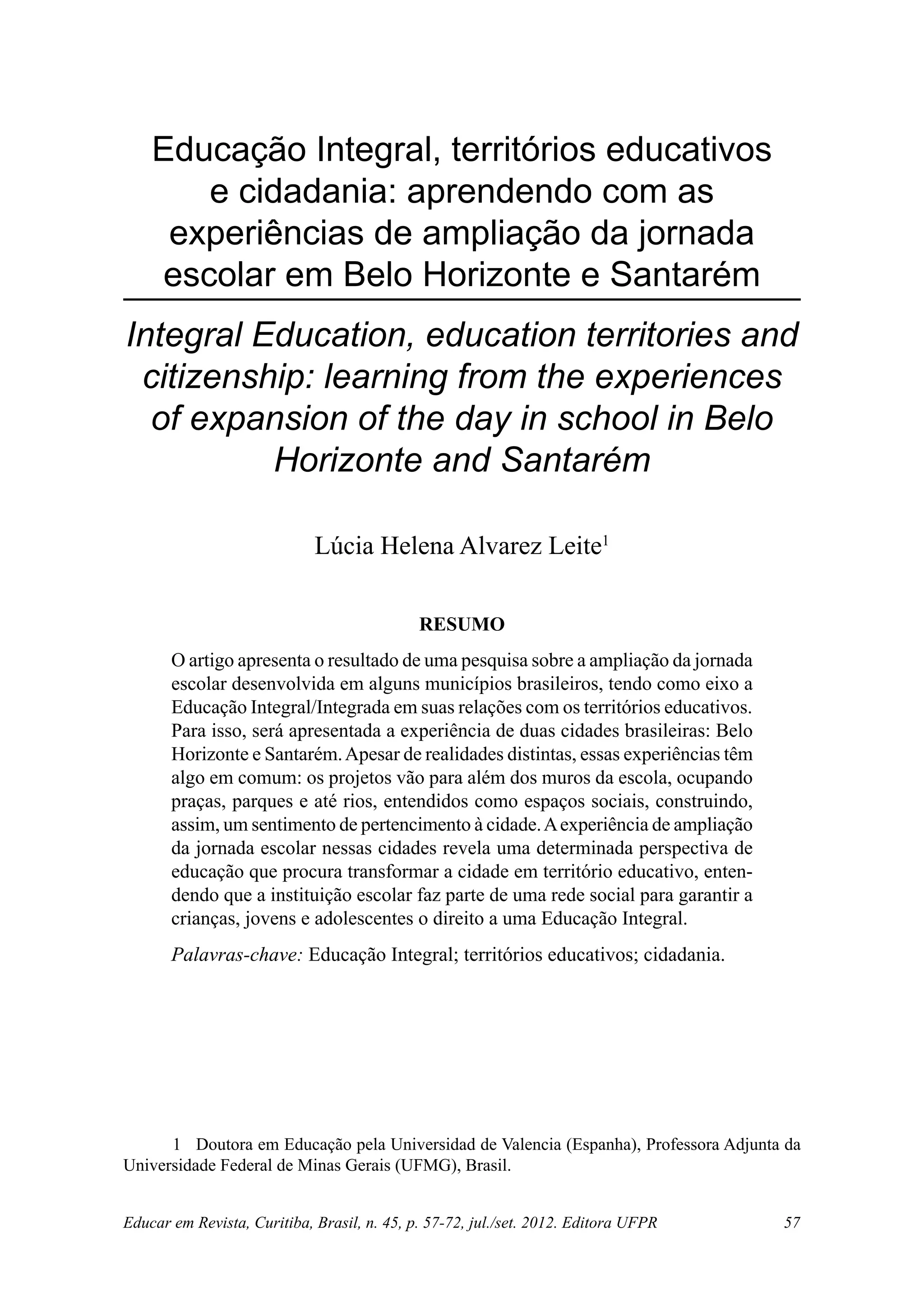 O documento descreve experiências de ampliação da jornada escolar em Belo Horizonte e Santarém, Brasil. Em Santarém, destaca-se o programa "Escola da Gente" com projetos de educação ambiental, arte, cultura e esporte que expandem o aprendizado para fora da escola, envolvendo a comunidade. Já em Belo Horizonte, o programa "Escola de Tempo Integral" oferece atividades diversificadas em períodos complementares ao escolar. Ambas visam uma educação integral ligada ao desenvolvimento dos estudantes e à c