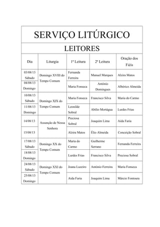 Este documento lista os leitores e suas respectivas funções para os serviços litúrgicos de vários dias entre 03/08/13 e 25/08/13, incluindo nomes de pessoas designadas para a 1a leitura, 2a leitura e oração dos fiéis em cada data.