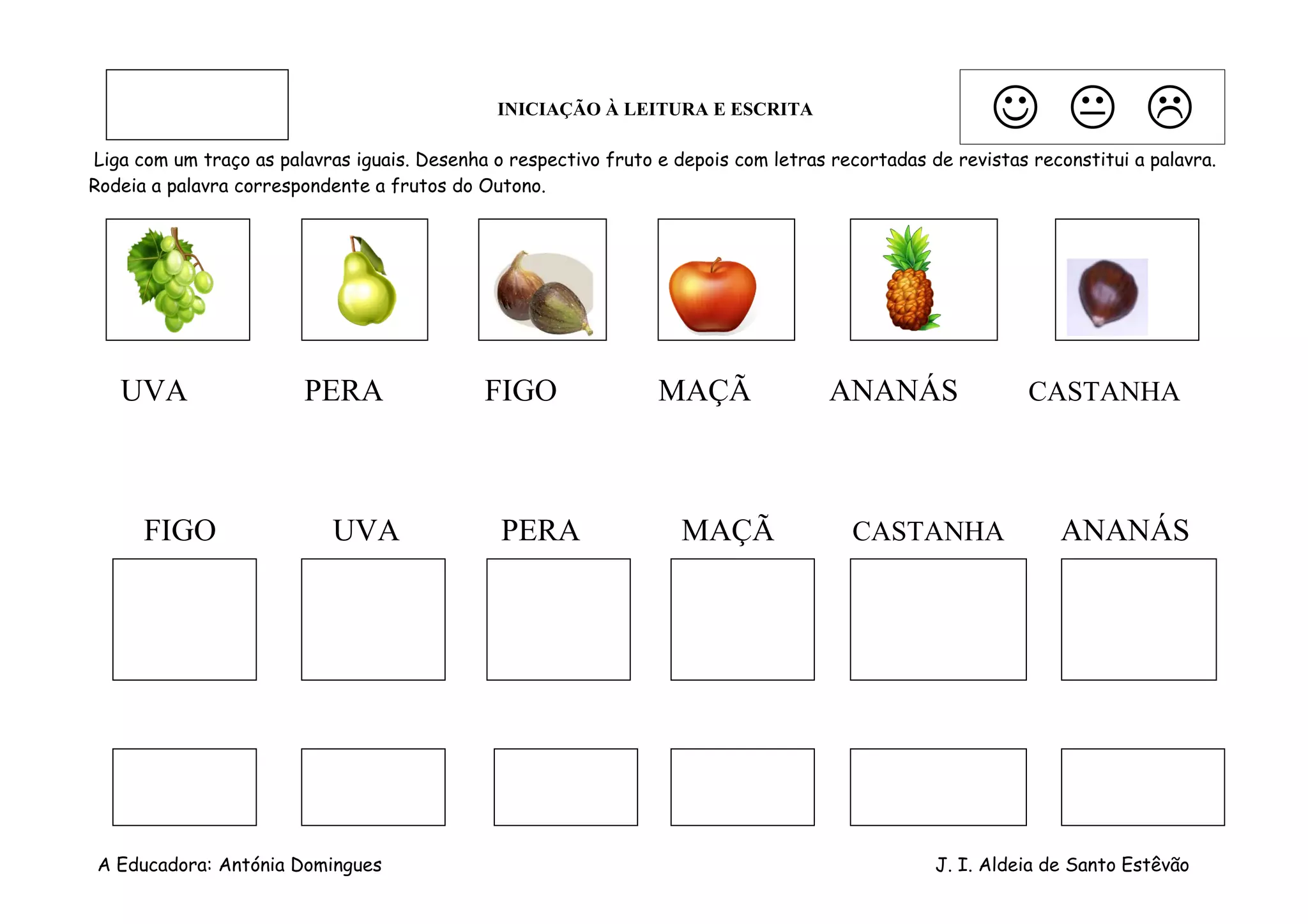 O documento fornece instruções para atividades de alfabetização envolvendo ligar palavras iguais com traços, desenhar frutos correspondentes e circundar palavras de frutos de outono. As atividades visam iniciar crianças na leitura e escrita através de exercícios práticos envolvendo frutas.