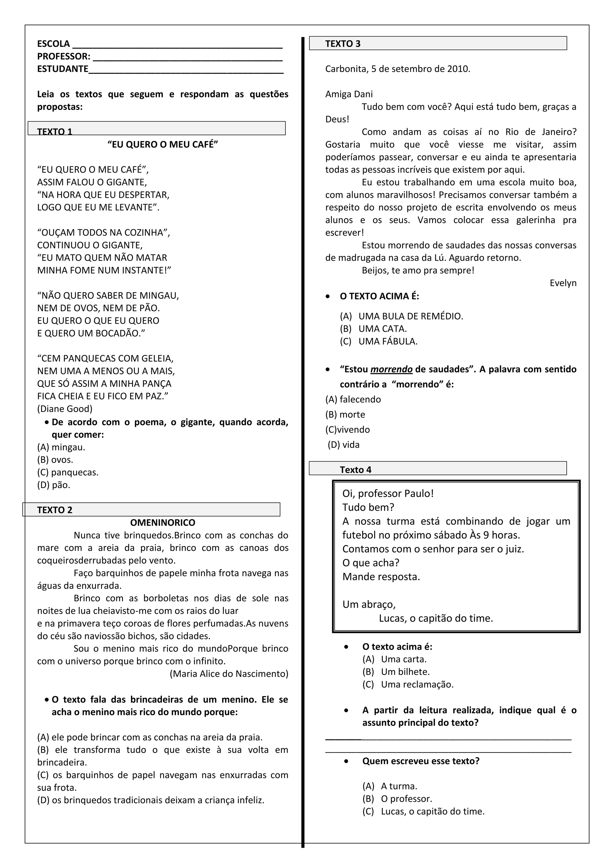 O documento contém 7 textos e questões sobre eles. O primeiro texto é um poema sobre um gigante que quer panquecas para comer. O segundo fala de um menino pobre que brinca com tudo à sua volta. O terceiro é uma carta entre amigas falando de saudades.