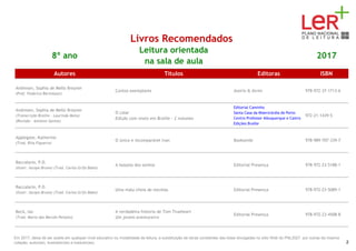 Este documento lista livros recomendados para estudantes do 8o ano, incluindo autores, títulos, editoras e ISBN. São fornecidos detalhes sobre edições em Braille de algumas obras. É indicado que em 2017 não serão aceites substituições das obras listadas por outras da mesma coleção ou autores.