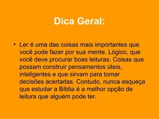 O documento discute a importância da leitura, especialmente da Bíblia, para o desenvolvimento espiritual e mental. Ele alerta sobre os perigos de ler materiais que não edificam a fé ou distraem da Palavra de Deus. A escolha consciente do que ler é fundamental para ouvir a voz de Deus.