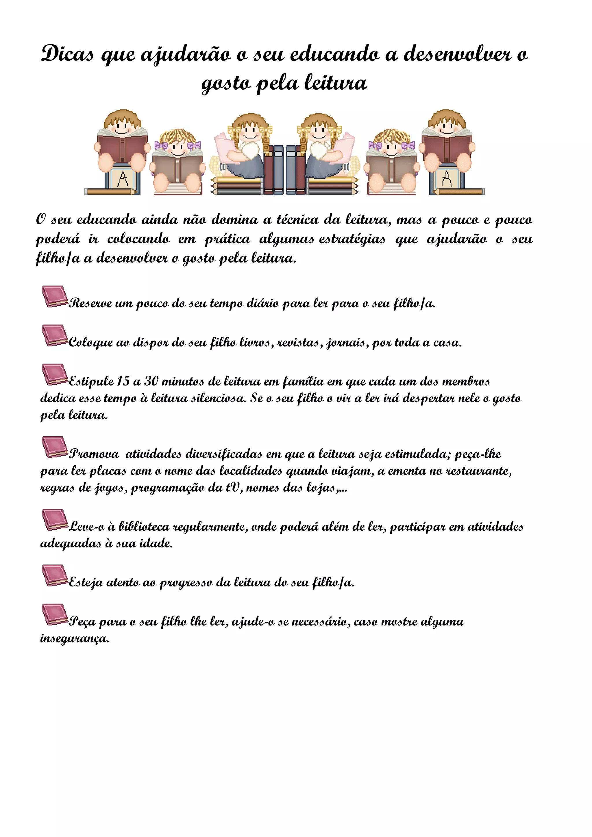 Este documento fornece dicas para ajudar crianças a desenvolverem o gosto pela leitura, como reservar tempo diário para ler para elas, ter livros disponíveis em casa, ler em família, estimular atividades que envolvam leitura e visitar regularmente a biblioteca.