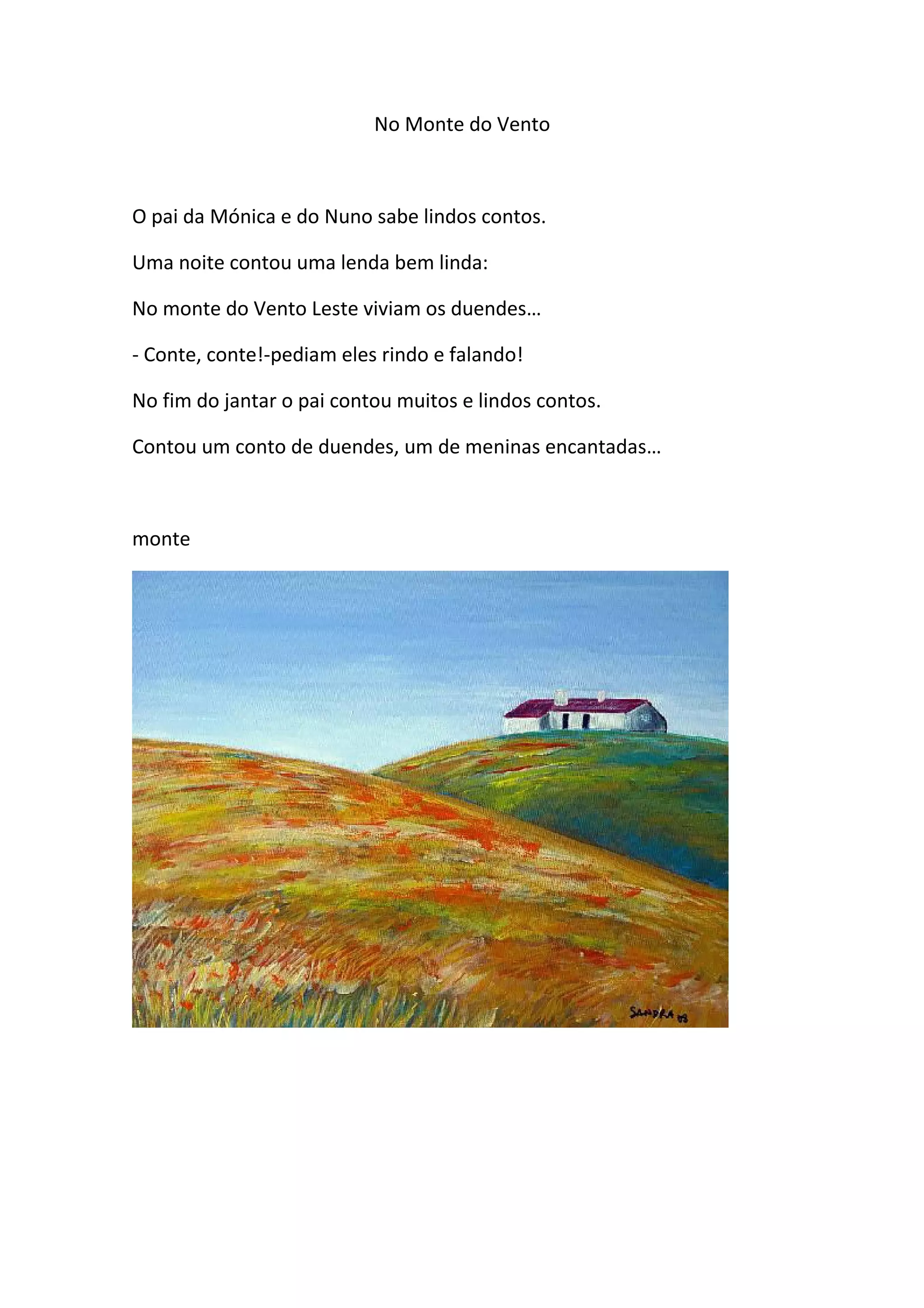 O pai conta histórias para os filhos Mónica e Nuno durante o jantar, incluindo uma lenda sobre duendes que vivem no Monte do Vento Leste e um conto sobre um esquilo que caiu da árvore e ficou tonto. As crianças pedem mais um conto e o pai decide contar a história do esquilo tonto que vai comer amoras, mas cai em um buraco escuro.