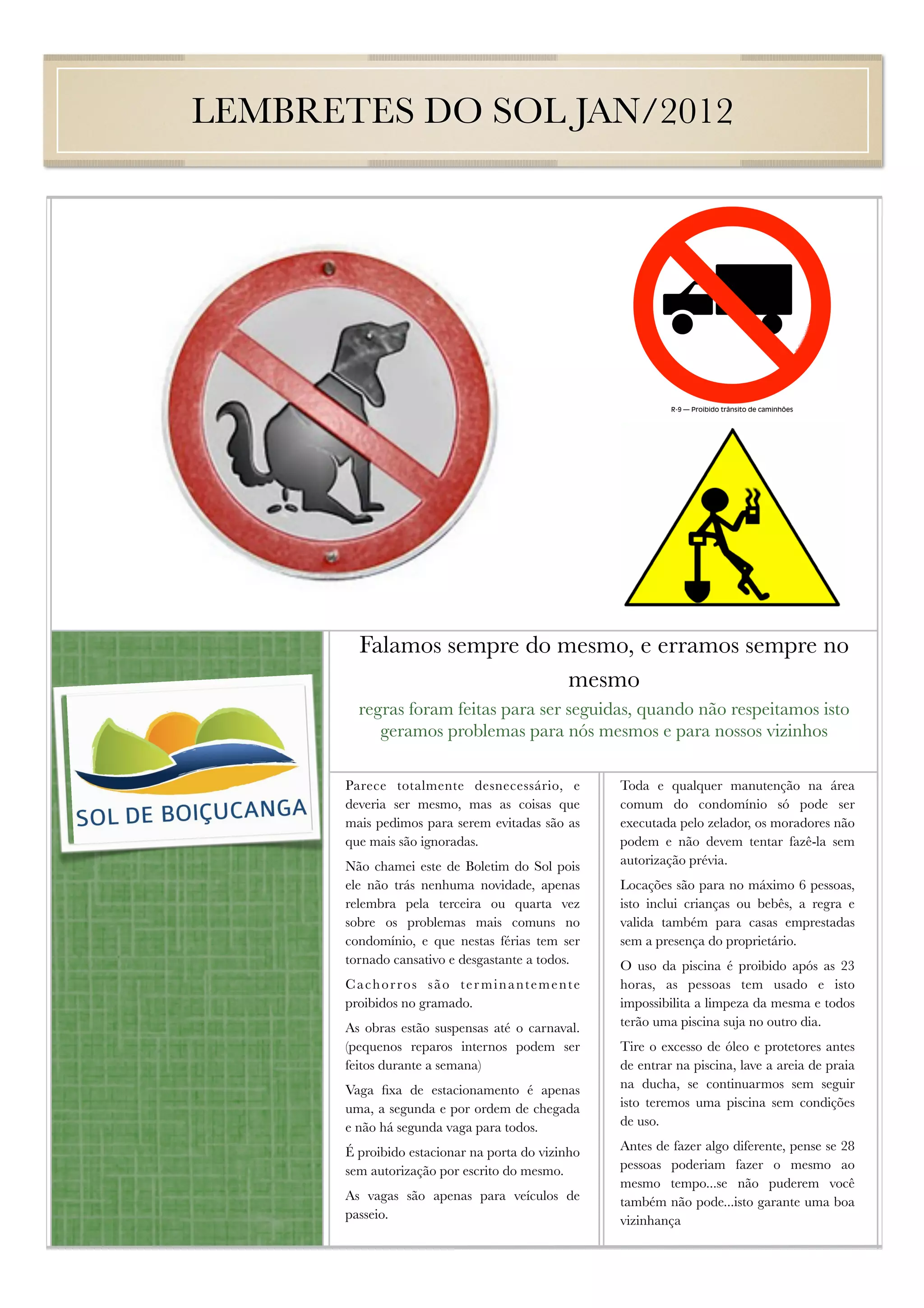 O documento resume as principais regras e lembretes para os moradores de um condomínio, incluindo: 1) Proibição de obras e manutenções não autorizadas, estacionamento em vagas erradas ou na porta do vizinho; 2) Limite de 6 pessoas por local, incluindo crianças; 3) Horário para uso da piscina até 23h e cuidados para mantê-la limpa.