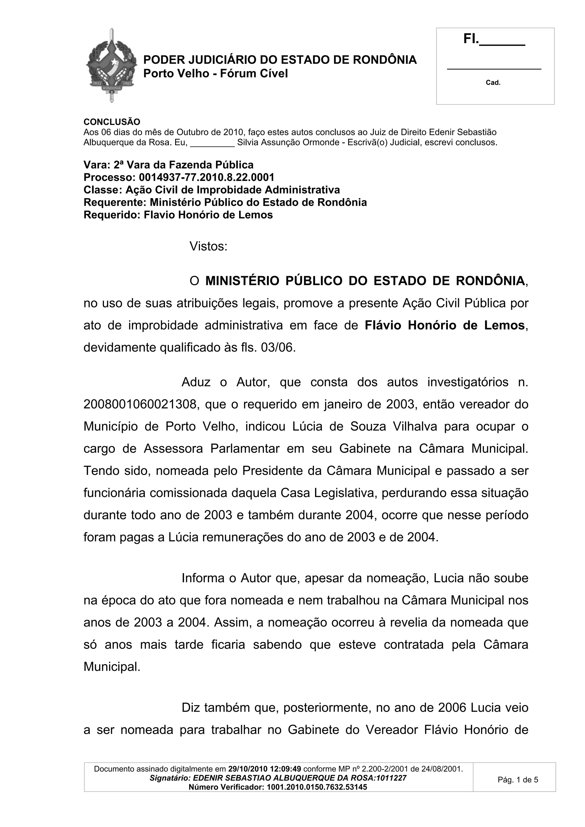 [1] O Ministério Público moveu uma ação civil pública contra Flávio Honório de Lemos por ato de improbidade administrativa. [2] A ação alega que Lemos nomeou Lucia de Souza Vilhalva para um cargo de assessora em seu gabinete em 2003-2004, porém ela não trabalhou nesse período e só ficou sabendo da nomeação anos depois. [3] O juiz rejeitou a defesa preliminar de Lemos e recebeu a ação civil, determinando sua citação para apresentar contestação.