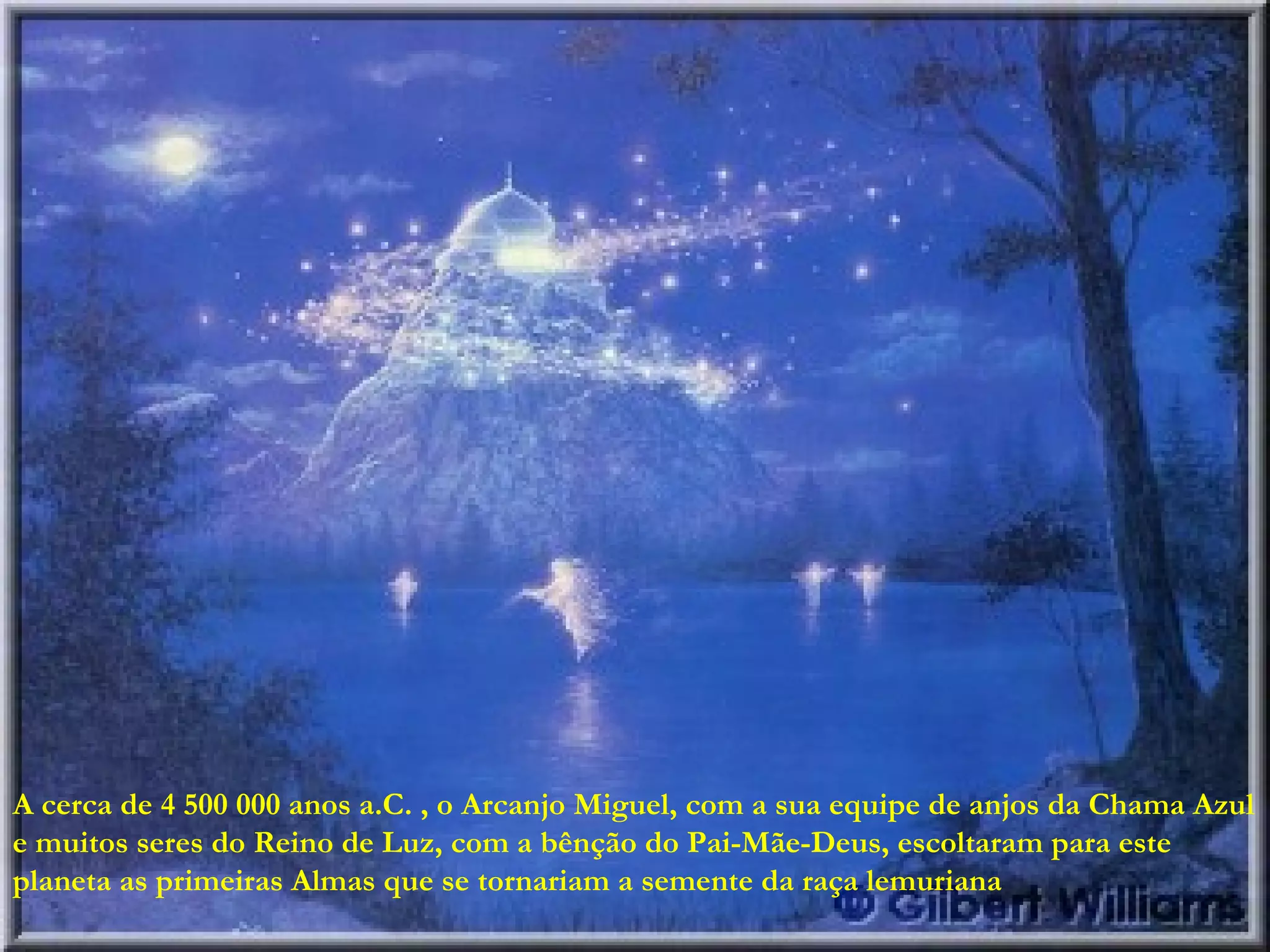 O documento descreve a história da civilização lemuriana, que existiu há cerca de 4,5 milhões de anos atrás. Lemúria era um continente avançado que abrangia partes do Oceano Pacífico. No entanto, guerras com a Atlântida levaram à destruição de ambas as civilizações cerca de 12.000 anos atrás devido a catástrofes naturais. Alguns lemurianos sobreviveram construindo uma cidade subterrânea chamada Telos.
