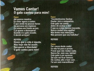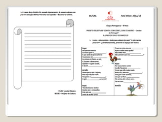 O documento descreve um projeto educativo sobre lendas portuguesas que inclui as seguintes atividades: (1) contar a história do Juiz de Vila Velha através de ilustrações e sons; (2) comparar duas versões da história; (3) um concurso de decoração de galos inspirados na história.