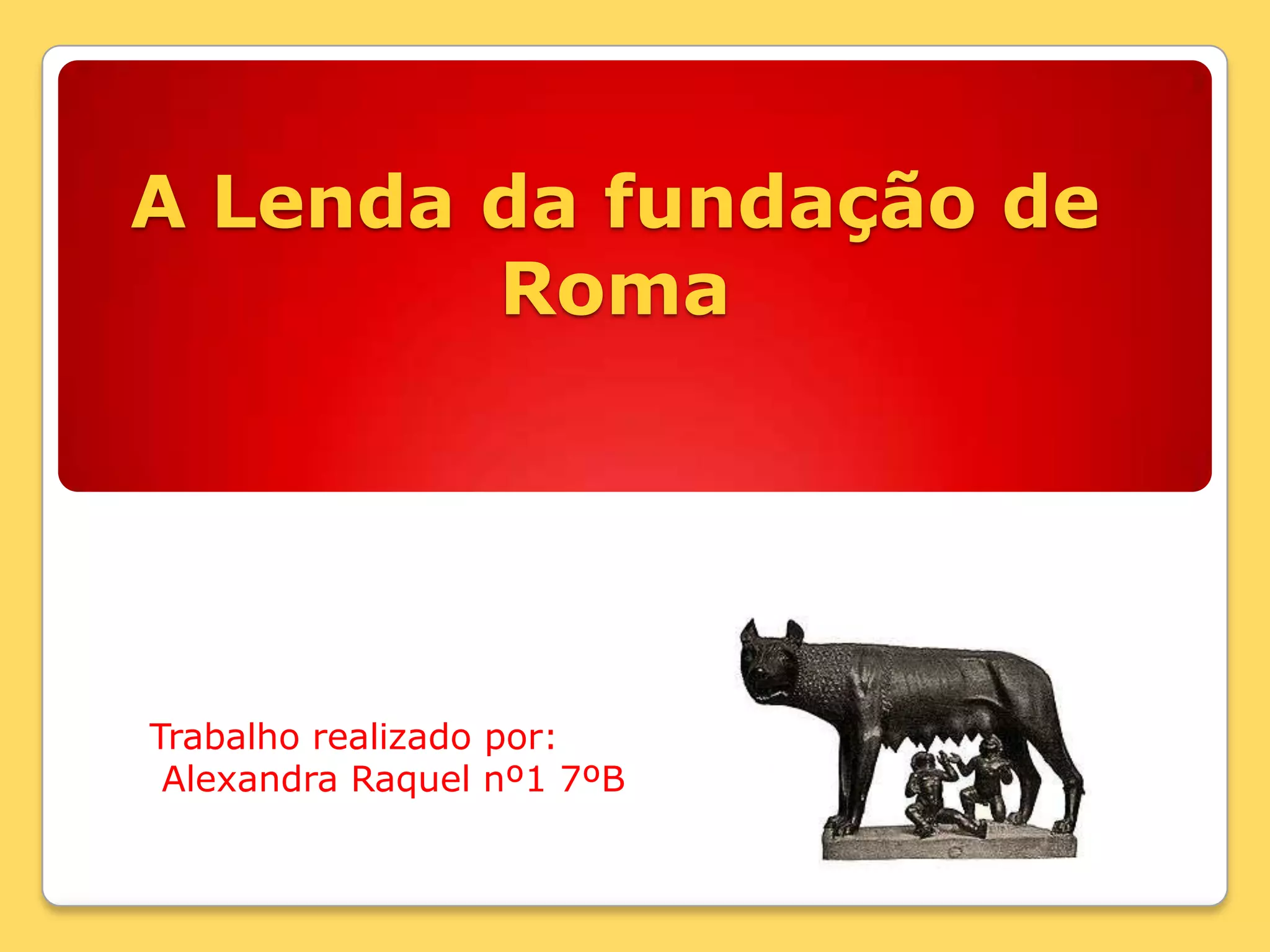 A lenda da fundação de Roma conta que os gêmeos Rômulo e Remo foram criados por uma loba e mais tarde fundaram a cidade de Roma, com Rômulo estabelecendo-a no monte Palatino. Historiadores acreditam que Roma foi fundada no século VIII a.C. por latinos e sabinos construindo fortificações para resistir aos etruscos. A data exata da fundação é desconhecida, mas é geralmente aceita como 21 de abril de 753 a.C.