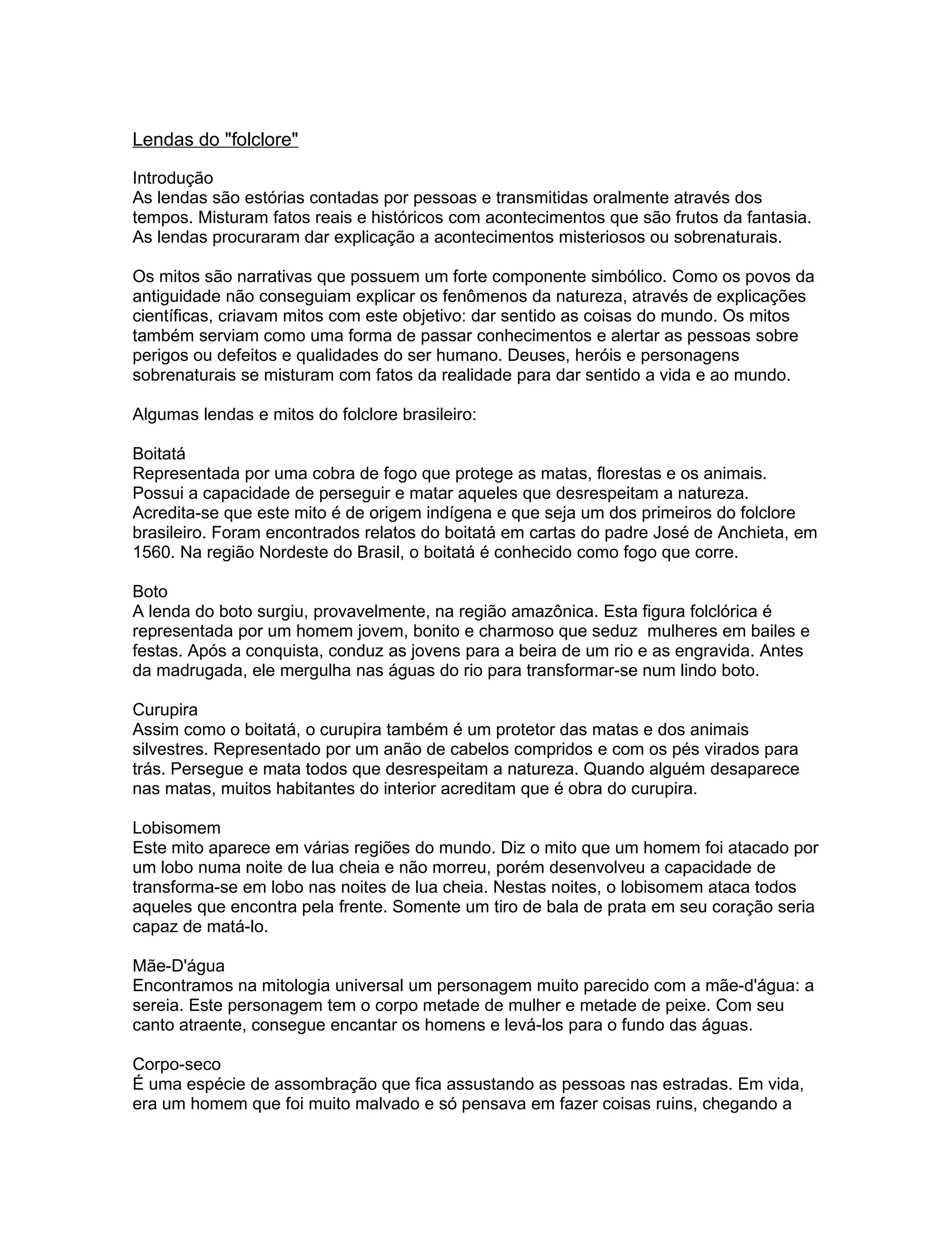 As lendas brasileiras incluem figuras como o Boitatá, representado como uma cobra de fogo protetora da natureza, o Boto que seduz mulheres e se transforma em um boto, e o Curupira, um anão protetor das matas com os pés virados para trás. Outras lendas incluem o Lobisomem, a Mãe D'água, o Corpo-seco, a Pisadeira, a Mula-sem-cabeça, a Mãe-de-ouro e o Saci-Pererê.