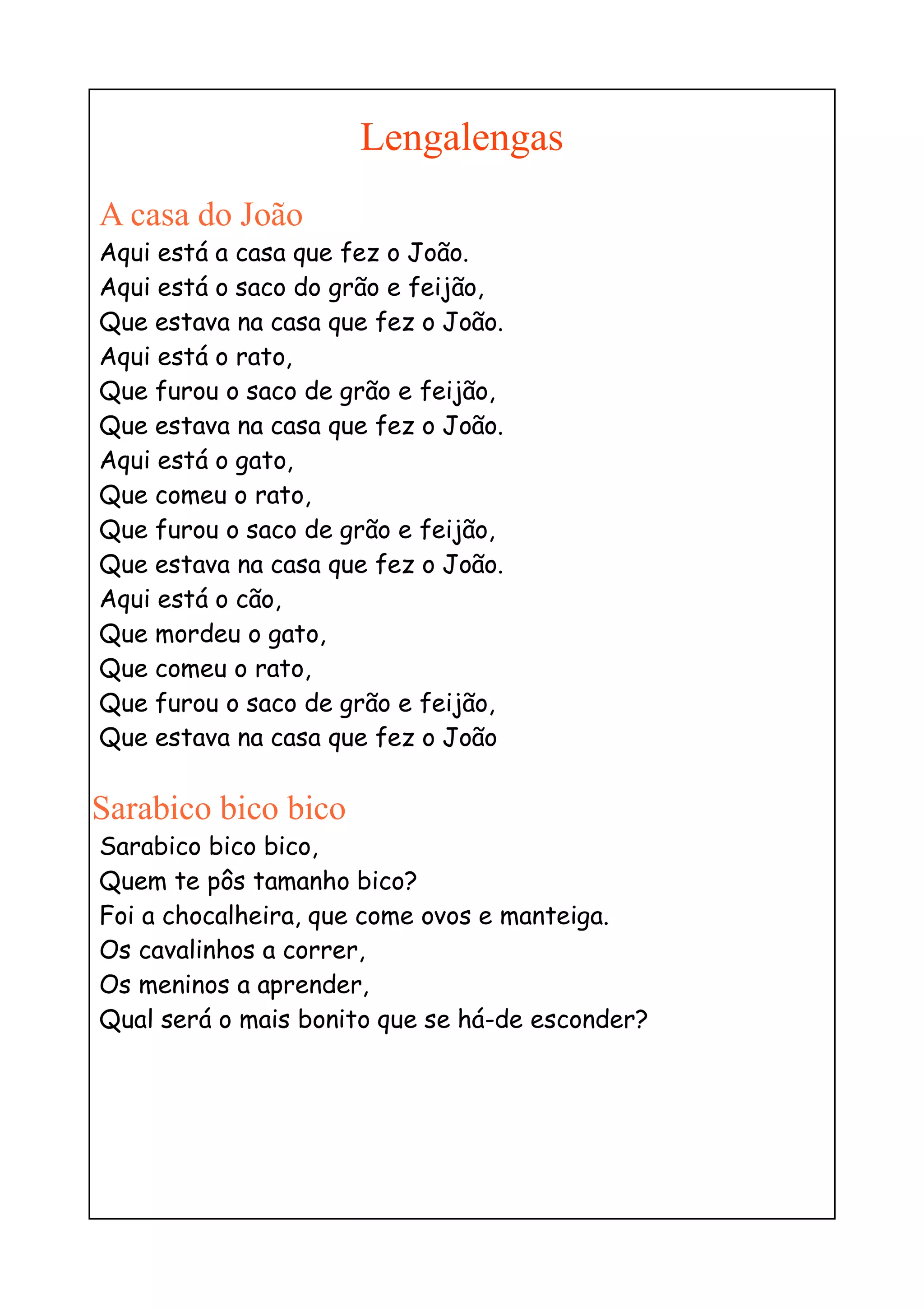 O documento contém várias lengalengas e rimas infantis portuguesas curtas. As rimas descrevem animais, objetos e ações comuns de forma simples e repetitiva para entreter e educar crianças.