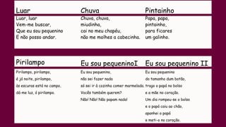 1) O documento contém várias lengalengas curtas em português que exploram rimas e ritmos. 2) As lengalengas descrevem cenas do cotidiano e da natureza envolvendo animais, objetos e atividades como chover, voar e comer. 3) Muitas lengalengas terminam com uma pergunta e resposta curta que continua a rima estabelecida.