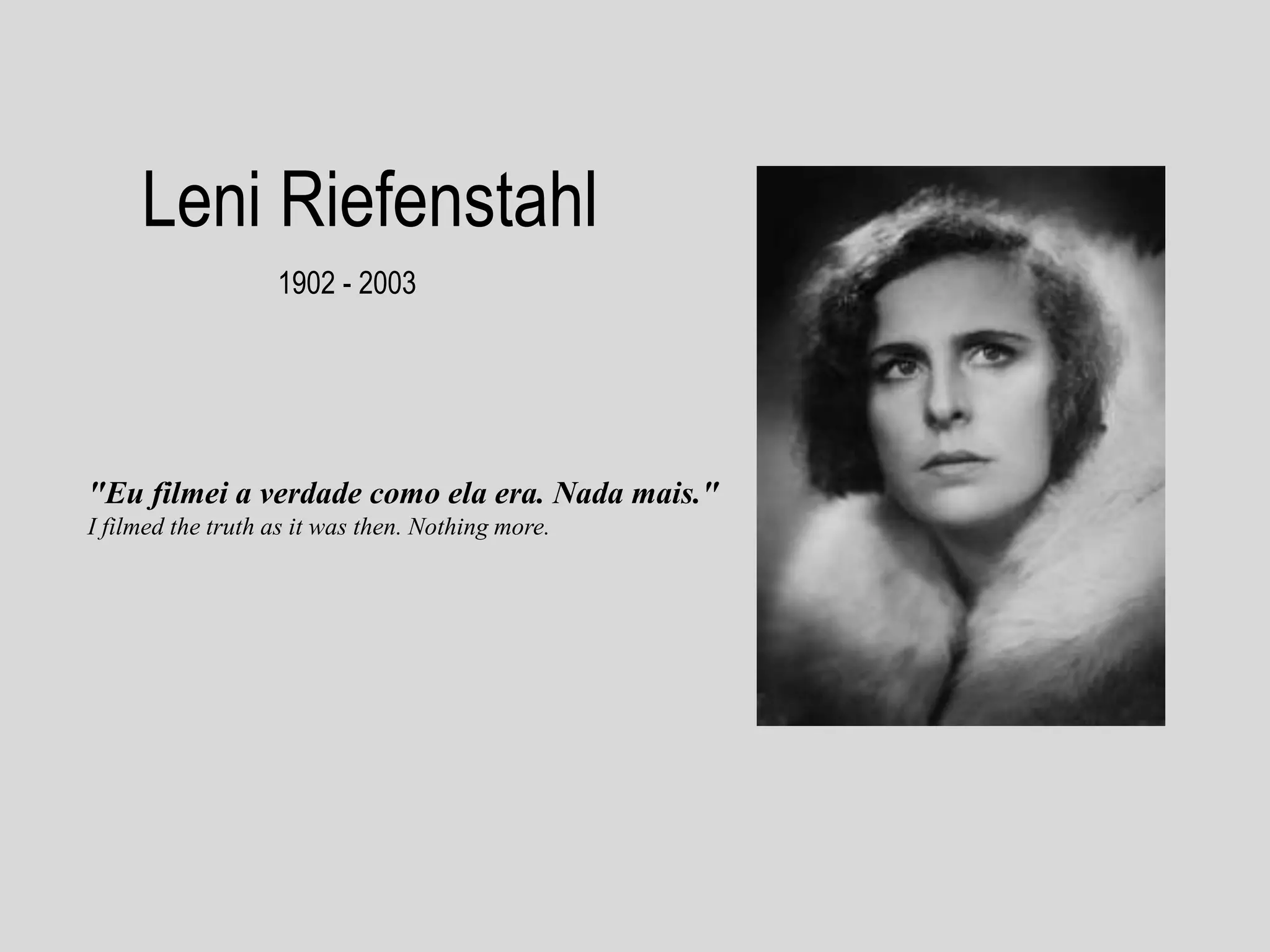 Leni Riefenstahl foi uma cineasta alemã nascida em 1902 que realizou importantes filmes de propaganda para o regime nazi, incluindo "O Triunfo da Vontade" sobre um comício do Partido Nazi em 1935. Ela também filmou os Jogos Olímpicos de 1936 e 1938, introduzindo novas técnicas cinematográficas. Após a guerra, ela tentou realizar outros filmes, mas muitos foram boicotados devido a seu trabalho para os nazistas.