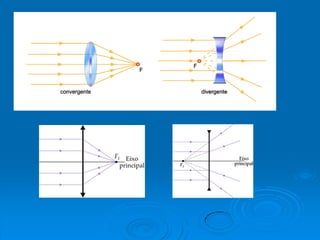 O documento descreve propriedades ópticas de lentes e do olho humano. Explica que lentes finas geralmente são convergentes e lentes grossas são divergentes. Descreve também casos de imagens formadas por lentes convergentes e divergentes e propriedades como distância focal, vergência e correção de defeitos de visão.