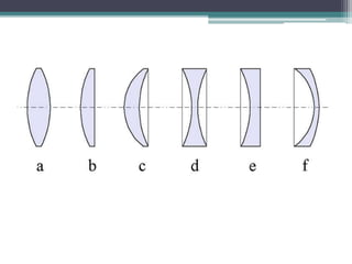 O documento discute origem e conceitos de lentes, incluindo seus seis tipos básicos e como formam imagens. Refração ocorre em superfícies asféricas e esféricas, com lentes convergentes e divergentes. Instrumentos como microscópios, lupas, câmeras e binóculos usam lentes para ampliar objetos.