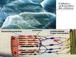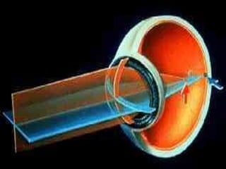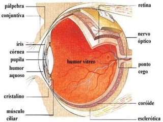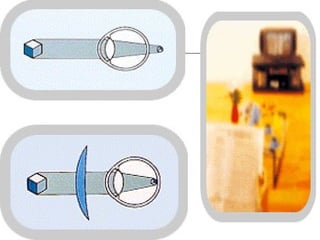 O documento discute os principais tipos e elementos de lentes ópticas, incluindo lentes convergentes, divergentes e suas propriedades como foco, distância focal e raios notáveis. Também aborda defeitos de visão como miopia, hipermetropia, astigmatismo e presbiopia, explicando suas causas e correções com lentes.