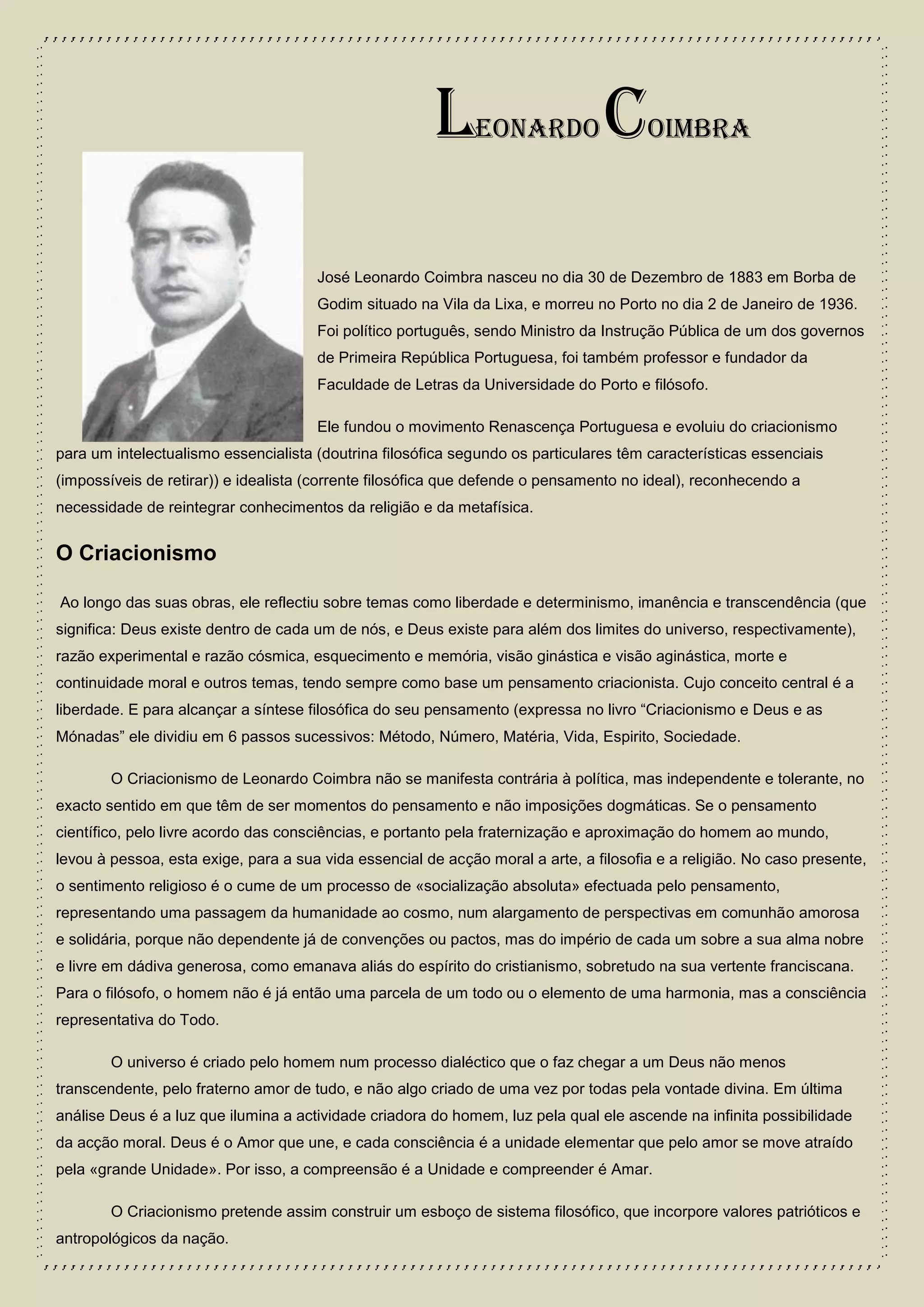 Leonardo Coimbra foi um político e filósofo português do século XX. Ele fundou a Faculdade de Letras da Universidade do Porto e o movimento Renascença Portuguesa. Seu pensamento filosófico, chamado de Criacionismo, defendia a liberdade e a visão de que o homem cria o universo através de um processo dialético que o leva a Deus.