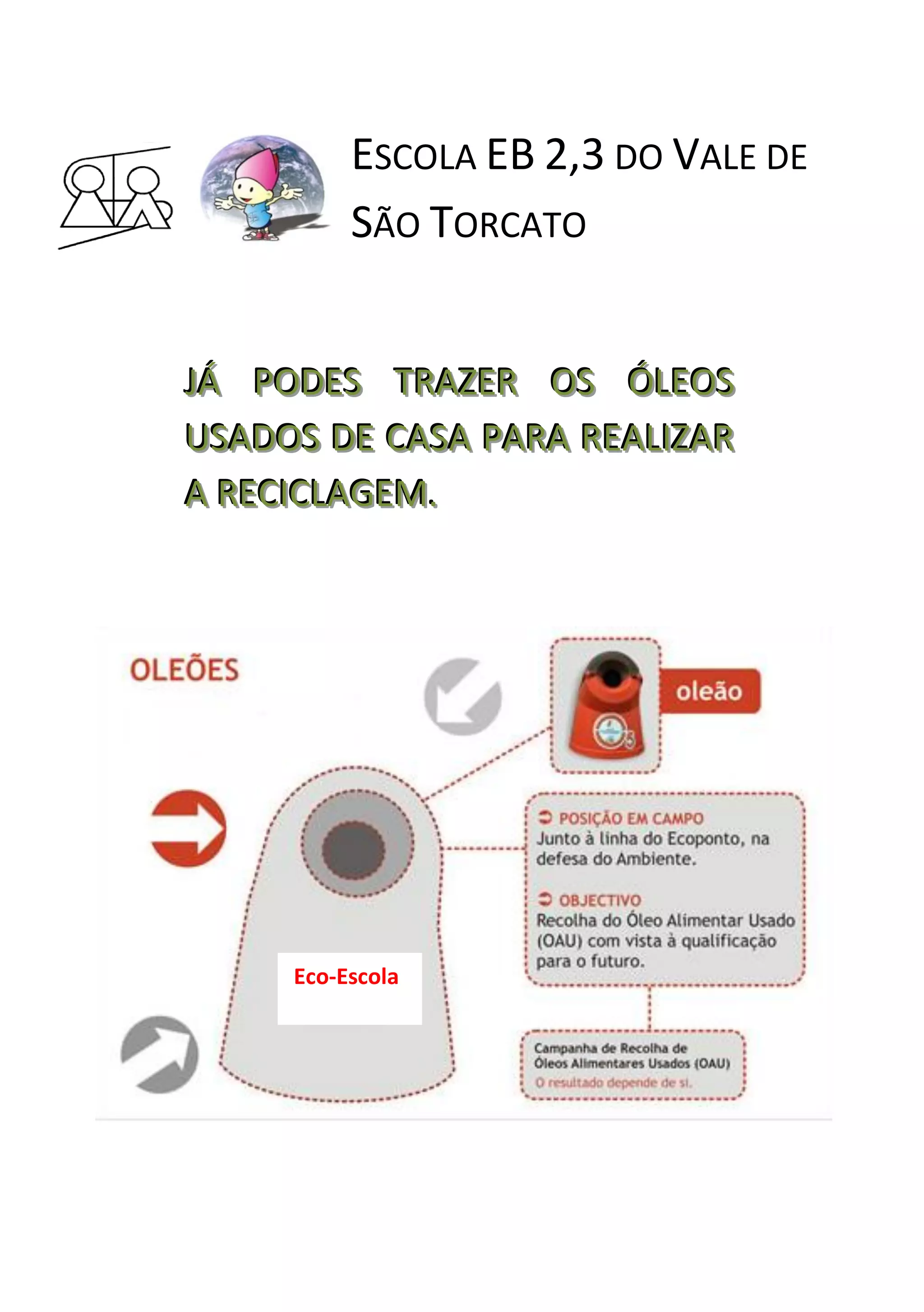 A escola EB 2,3 do Vale de São Torcato está pedindo aos alunos que tragam óleos usados de casa para realizar a reciclagem como parte do programa Eco-Escola.