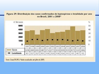 O documento discute a leptospirose, uma doença febril causada por bactérias do gênero Leptospira transmitida principalmente por urina de animais infectados. A doença pode variar de assintomática a grave e é endêmica no Brasil, onde casos aumentam durante enchentes. O diagnóstico é clínico e laboratorial e o tratamento é feito com antibióticos. Controle de roedores e melhoria do saneamento básico são essenciais para prevenção.
