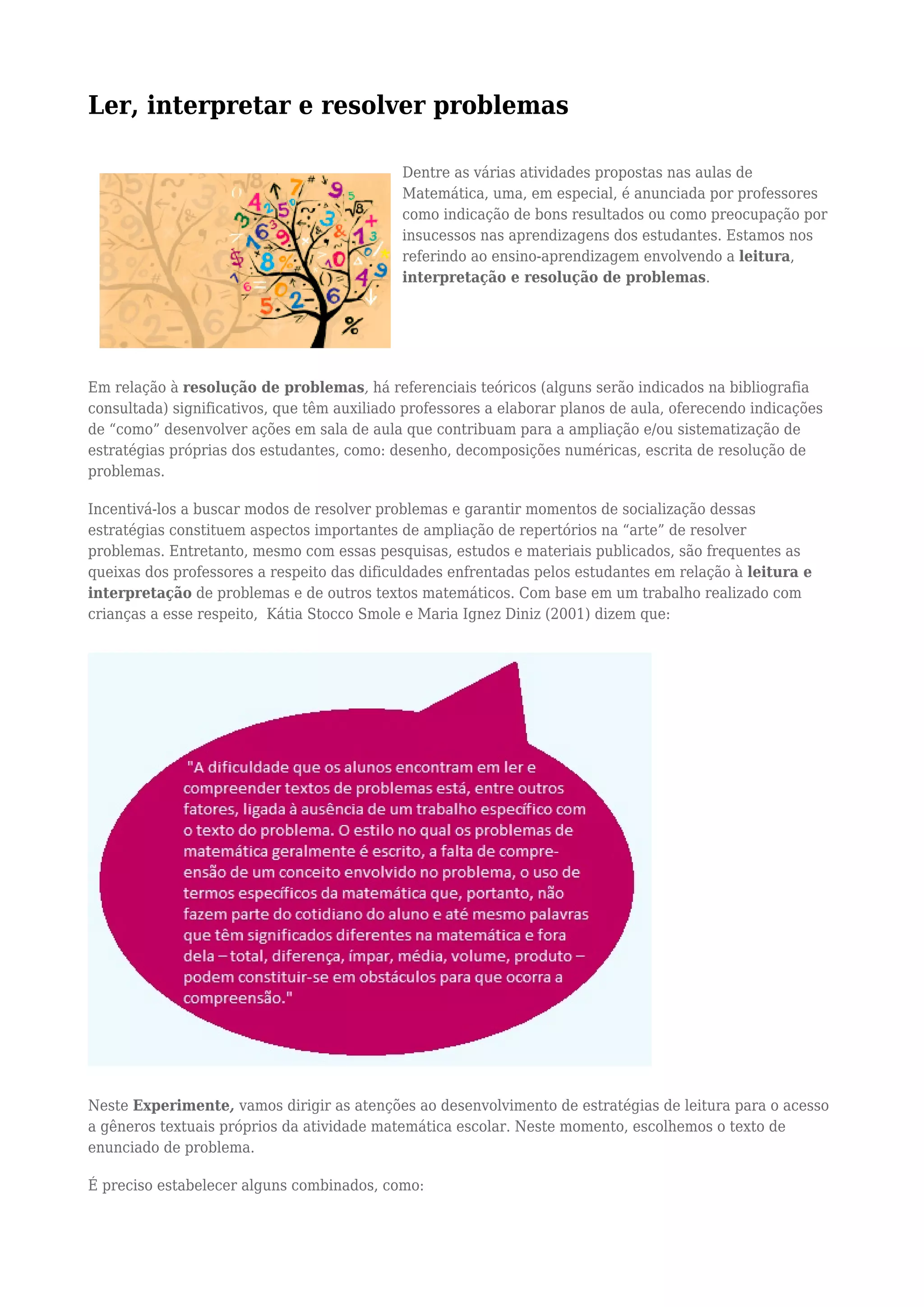O documento discute a importância do desenvolvimento de estratégias de leitura para a resolução de problemas matemáticos. Ele propõe uma atividade em que os alunos analisam dois textos, um descrevendo uma situação e outro propondo uma pergunta, e desenvolvem modos de responder à pergunta usando cálculos, desenhos ou palavras. A atividade objetiva mostrar que a expressão "a mais que" não significa necessariamente somar, mas comparar, e que a escolha entre somar ou subtrair depende do contexto.