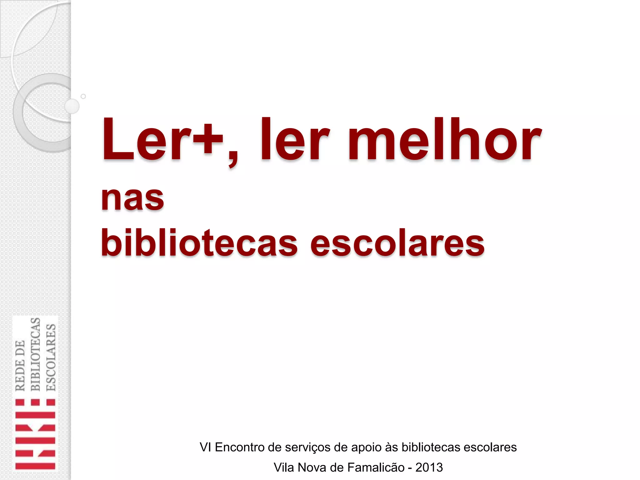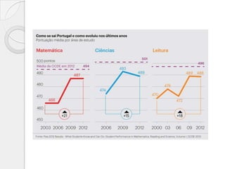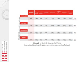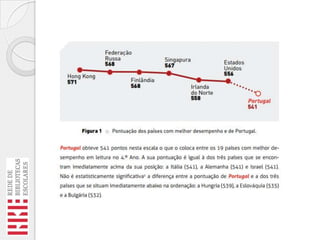O documento discute a importância da leitura e do desenvolvimento de habilidades de leitura entre crianças e estudantes. Apresenta dados de avaliações internacionais que medem o desempenho dos alunos portugueses em leitura e outros domínios, notando melhorias contínuas, mas ainda abaixo da média da OCDE. Defende que a biblioteca escolar desempenha um papel fundamental no apoio ao trabalho docente e na promoção da leitura para o sucesso escolar.