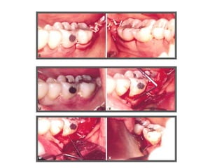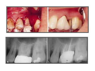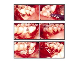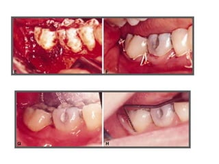 O documento discute lesões de furca e seu tratamento periodontal. Aborda classificações de lesões de furca, procedimentos cirúrgicos como rizectomia e odontossecção, e técnicas regenerativas como túnel radicular e regeneração tecidual guiada. Também fornece exemplos clínicos ilustrando diferentes abordagens para tratamento de lesões de furca.