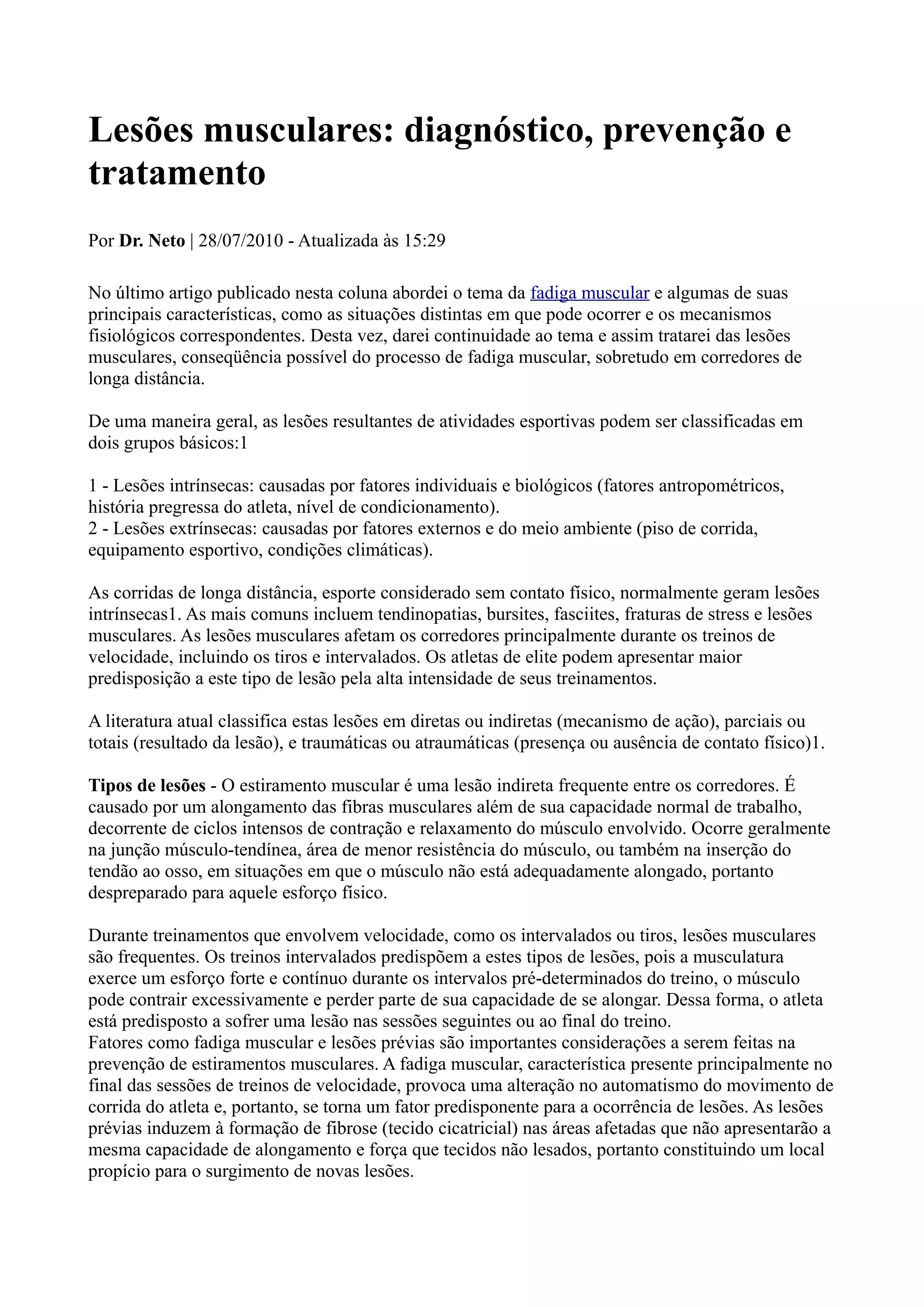 1) O documento discute lesões musculares em corredores, classificando-as em lesões intrínsecas ou extrínsecas e abordando os tipos de lesão como estiramentos musculares.