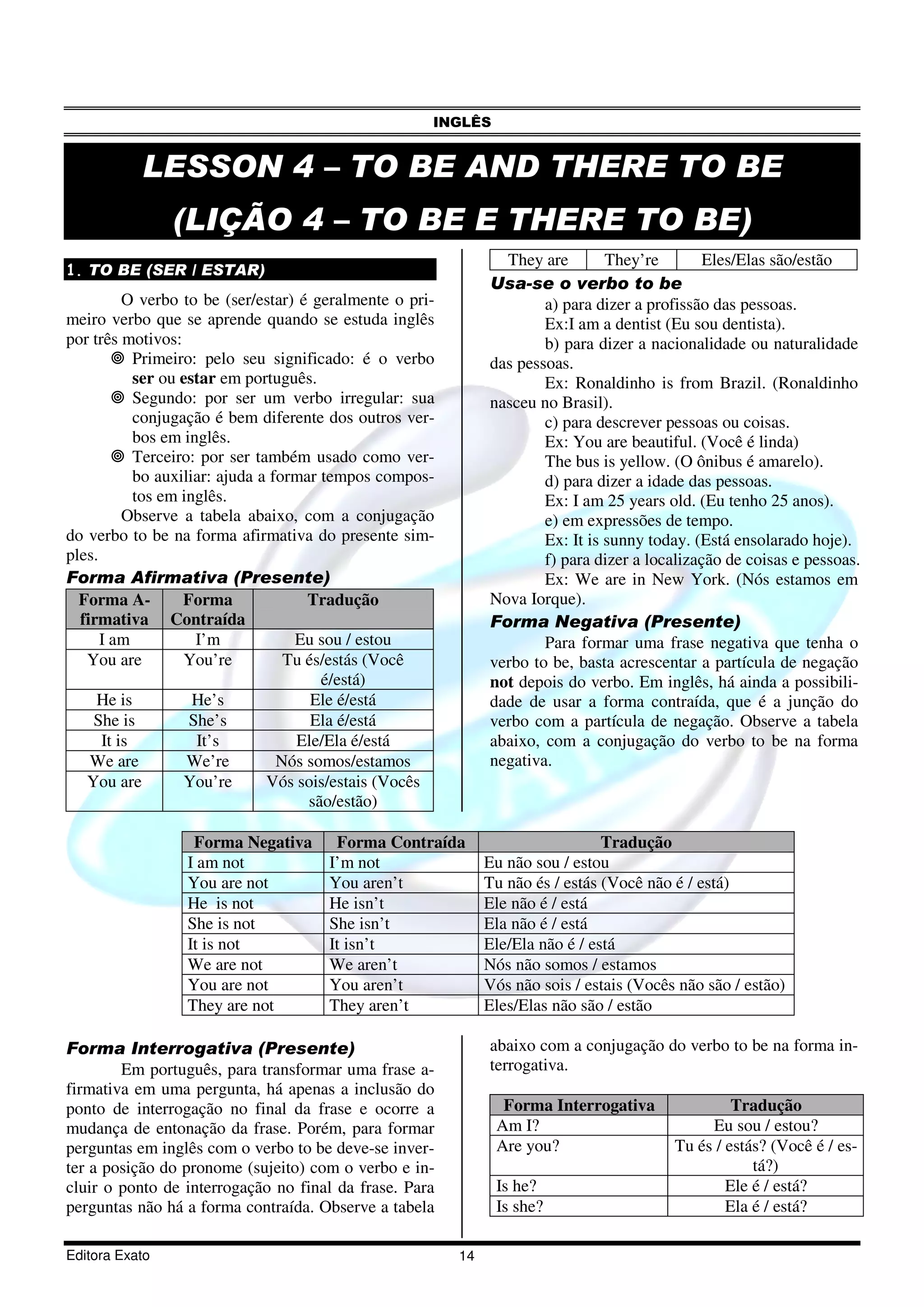 Este documento apresenta lição sobre o verbo "to be" e "there to be" em inglês. Explica que "to be" é geralmente o primeiro verbo aprendido por ser equivalente a "ser/estar" em português e por ser irregular. Fornece tabelas com a conjugação de "to be" no presente nas formas afirmativa, negativa e interrogativa. Também explica que "there to be" é equivalente a "haver" no sentido de existir e concorda com o substantivo seguinte.