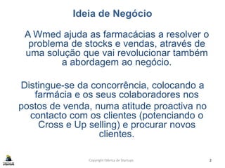A Wmed ajuda as farmácias a resolver problemas de estoque e vendas com uma solução que revolucionará seu modelo de negócios, colocando os funcionários da farmácia em contato proativo com os clientes para aumentar as vendas e encontrar novos clientes. O documento descreve os testes realizados para validar hipóteses sobre o modelo de negócios e os resultados obtidos.