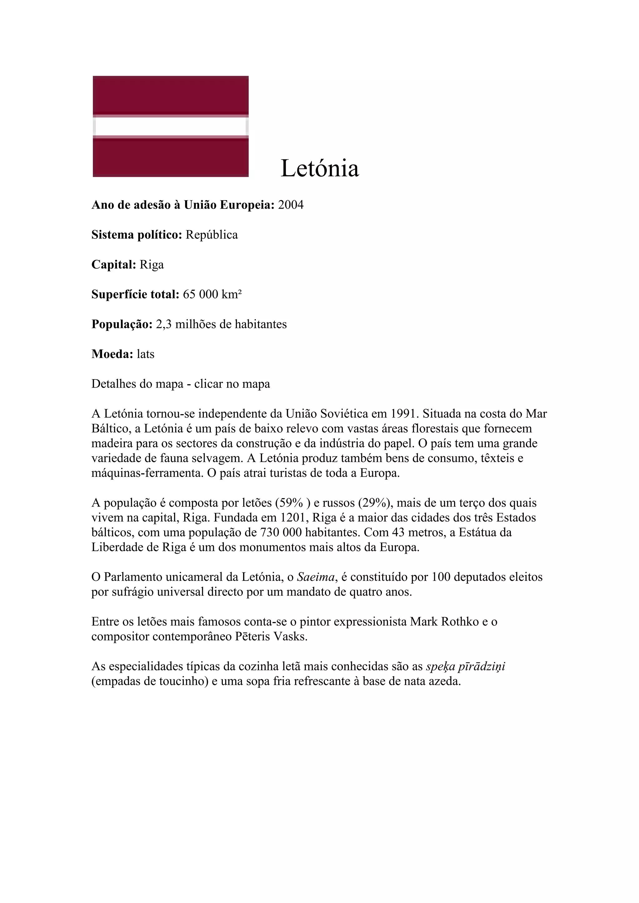 A Letônia tornou-se independente da União Soviética em 1991 e juntou-se à União Europeia em 2004. Sua capital e maior cidade é Riga, que abriga quase um terço de sua população de 2,3 milhões, composta principalmente por letões e russos. A Letônia tem uma economia diversificada baseada na produção de madeira, alimentos, têxteis e máquinas, além de atrair turistas para sua capital histórica e paisagens florestais.