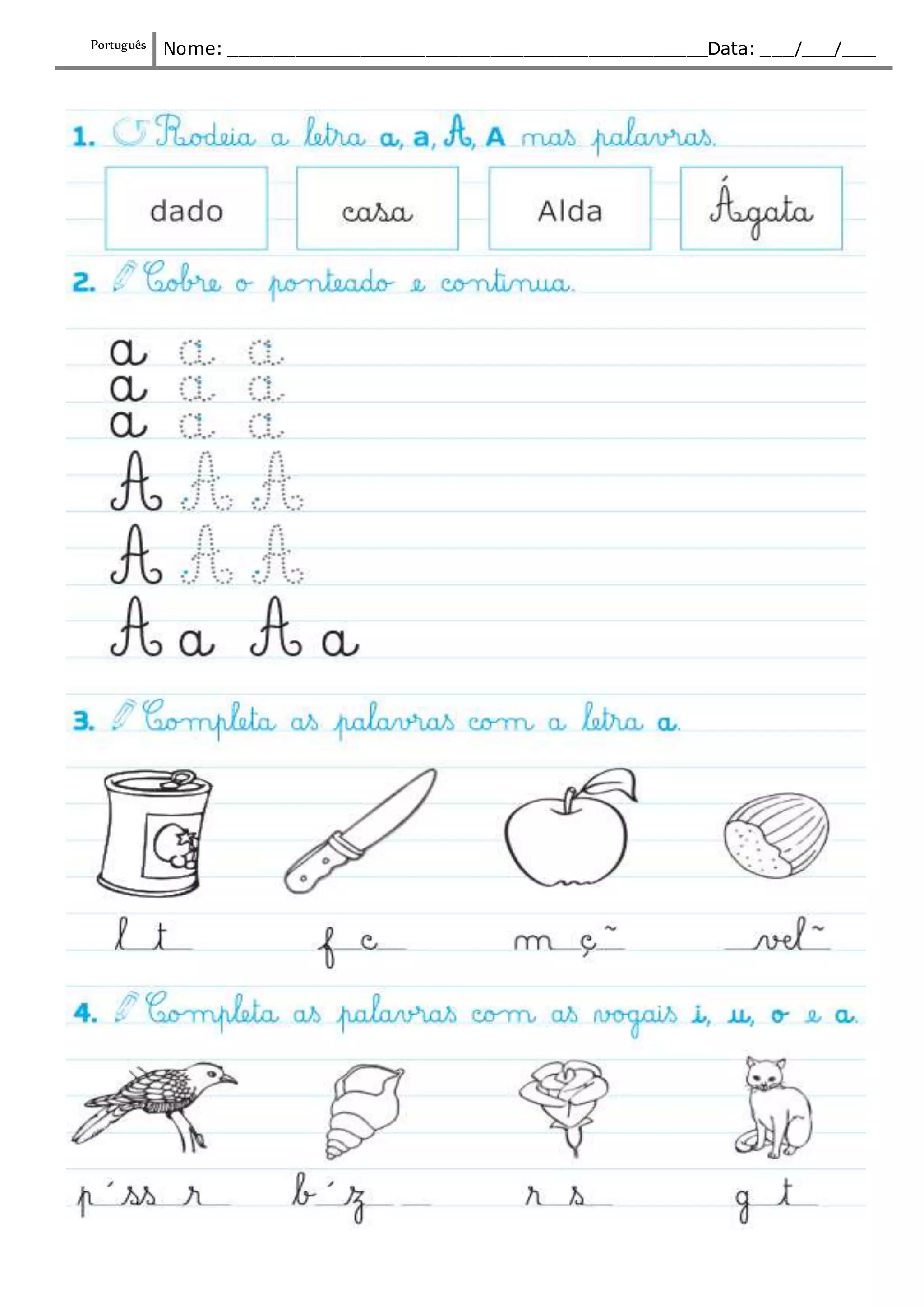 O documento pede o nome e data em português. Solicita o nome completo da pessoa e a data de preenchimento do formulário no formato dia/mês/ano.