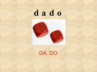 O documento apresenta uma série de palavras em espanhol relacionadas a um jogo de dominó, com as letras sendo reveladas gradualmente através de underlines para formar cada palavra. As palavras reveladas incluem "dado", "dominó", "dedo" e "diana".