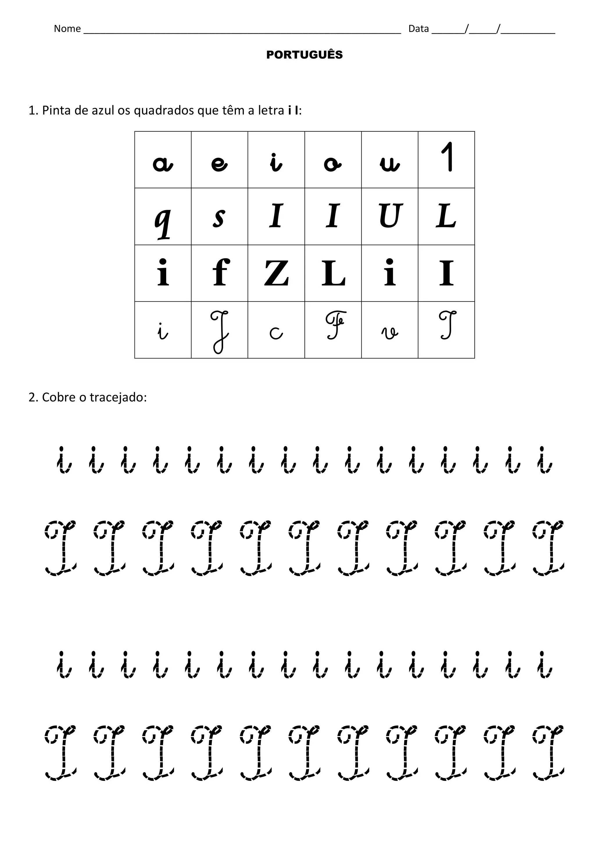 Este documento contém três exercícios de português para crianças: 1) Pintar de azul os quadrados com a letra "i" minúscula e de verde a letra "I" maiúscula. 2) Cobrir um tracejado. 3) Seguir o caminho de uma formiga e cobrir o pontilhado.